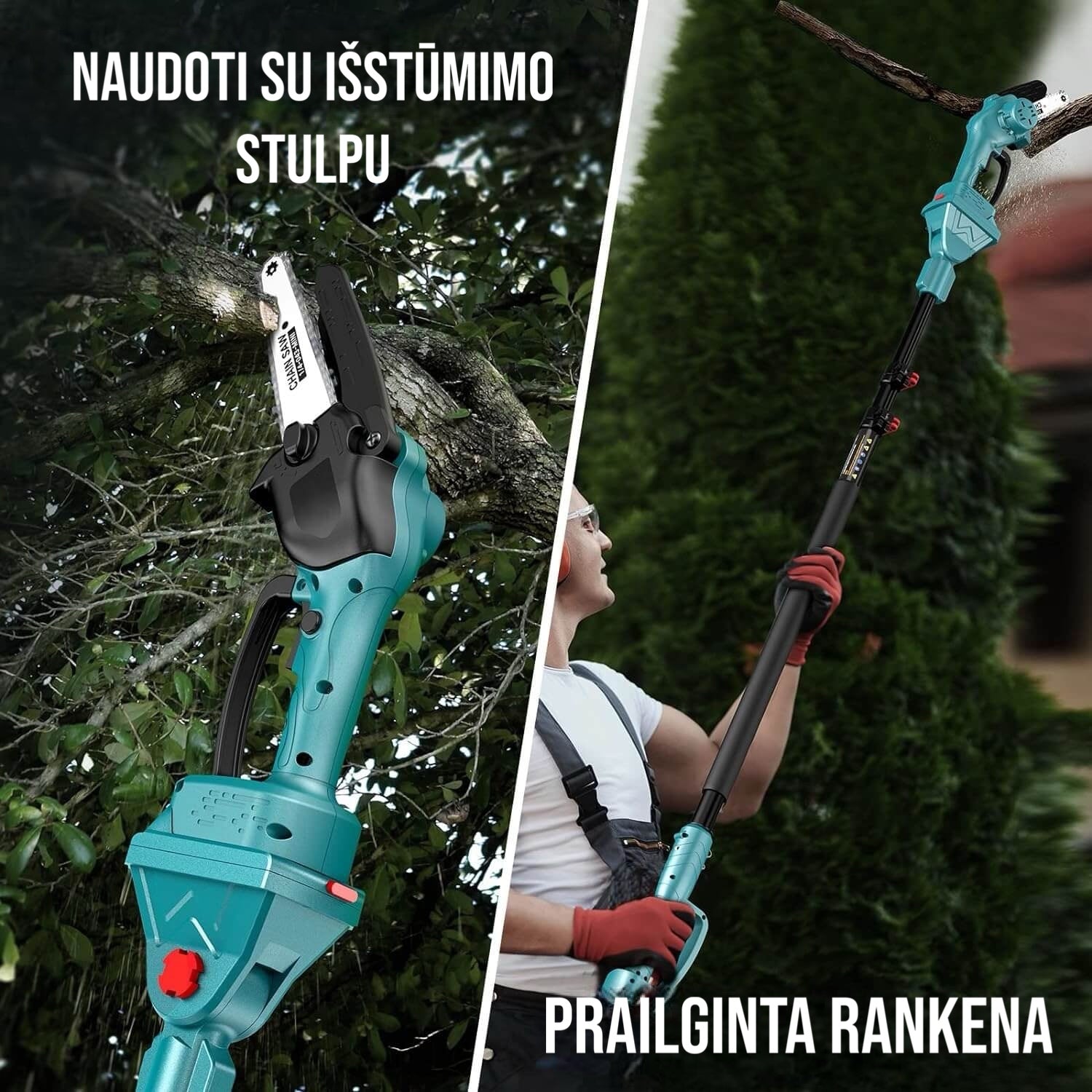 Lyginant su tradiciniais grandinės pjūklais ir šakų pjovimo žirklėmis, mūsų 2 in 1 pjūklas tvarko aukštas šakas ir malkų pjovimą be pavojingų kopečių ar tradicinių rankinių įrankių, padarant pjovimą saugesnį ir lengviau valdomą. Naudotas bešepetėlinis elektros variklis sukuria nulinę taršą ir yra tylesnis nei benzininis grandinės pjūklas. Ar esate sodo entuziastas ar profesionalas, šis šakų pjūklas yra jūsų patikimas padėjėjas.