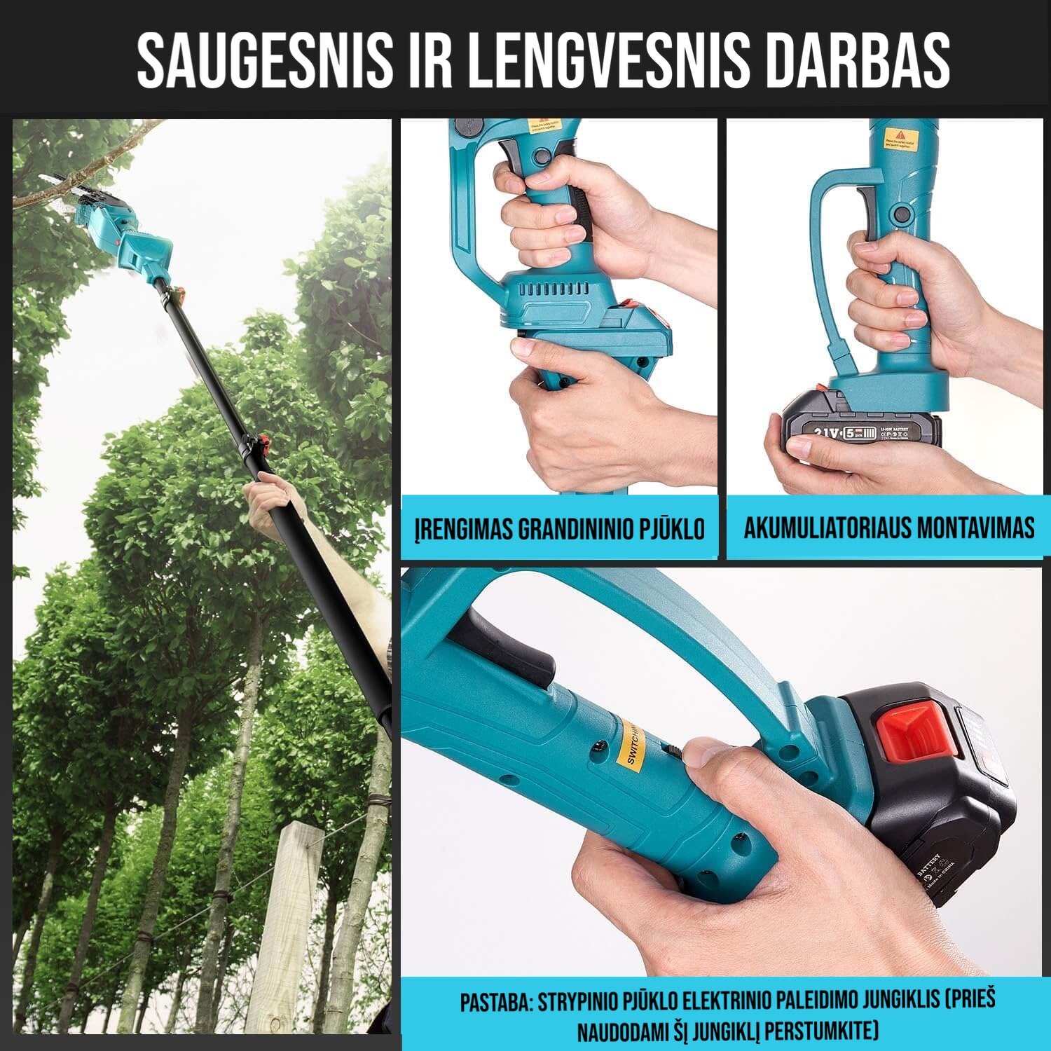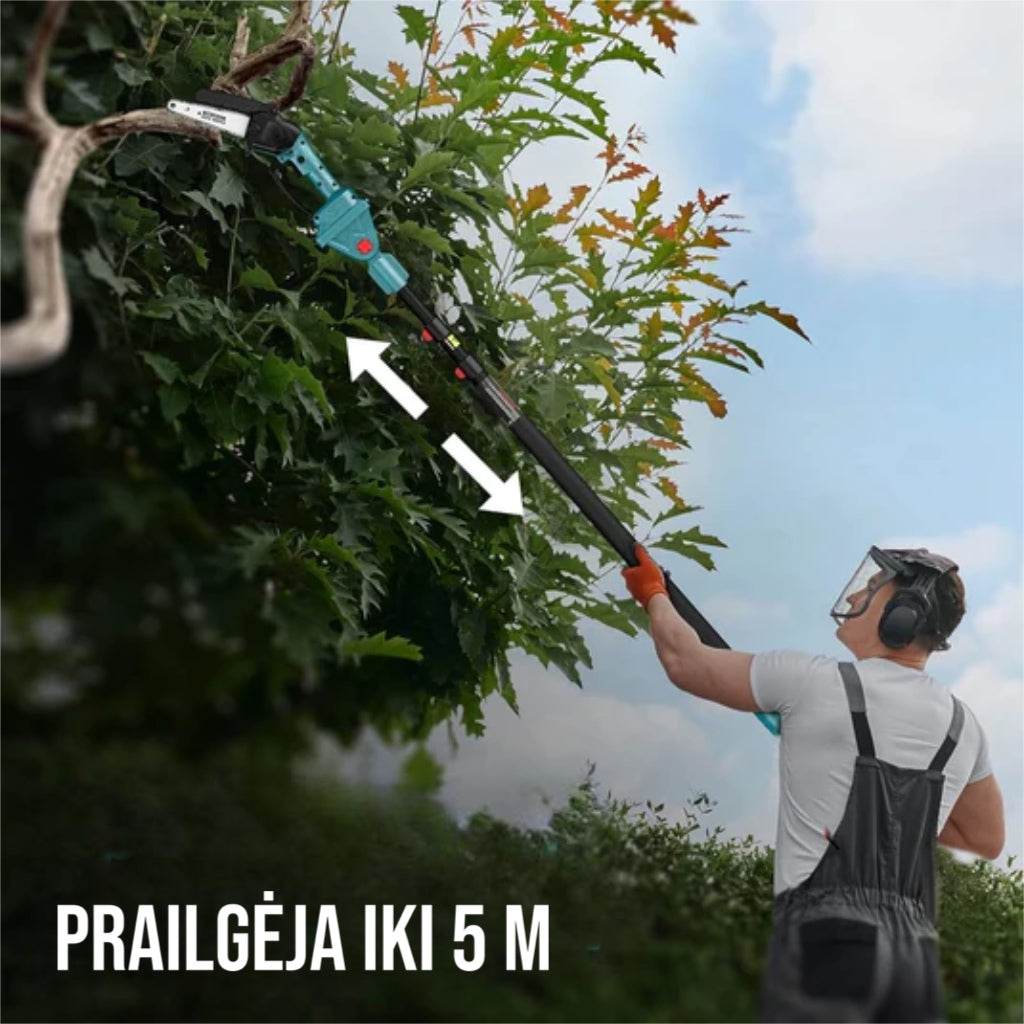 Pagal išsamius baterinių grandinės pjūklų tyrimus, mūsų pjūkle buvo atlikta daugybė atnaujinimų. Mūsų ilgos rankenos pjūklas turi ilgą strypą, leidžiantį jį pratęsti iki 140 cm~300 cm, kad būtų galima kirpti aukštas šakas ir apskritai sunkiai pasiekiamus plotus ir su suaugusiųjų ūgiu galite pasiekti iki 500 cm, padarydami pjautymo užduotis lengvą užduotimi.