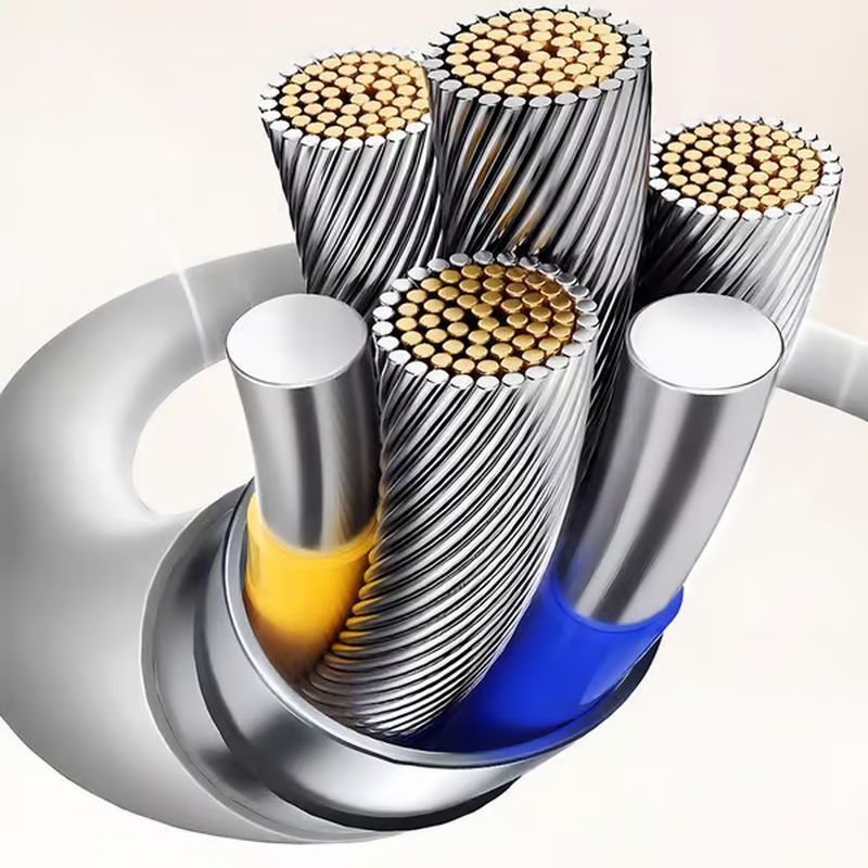 🔄 4-in-1 dizainas – vienas kabelis su USB-A, Lightning, dvigubu USB-C jungtimis, pritaikytas įvairiems įrenginiams.