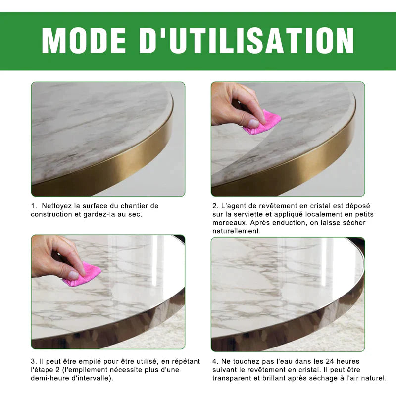 - Prieš naudojant priemonę rekomenduojama nuvalyti paviršius drėgna šluoste. Tuomet keletą lašų valiklio paskirstykite ant paviršių ir šluoste nuvalykite. Leiskite pilnia nudžiūti priemonei. Jeigu norite ilgalaikio blizgesio rekomenduojama pakartoti procesą antrą kartą.