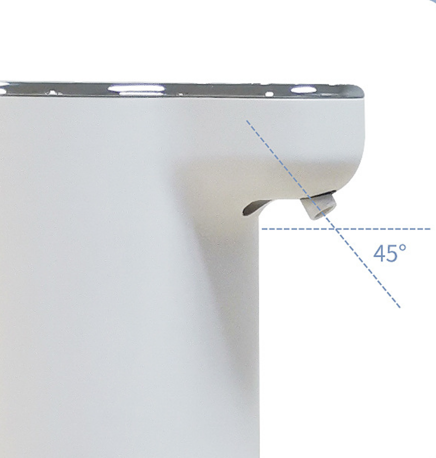 45° muilo dozatoriaus išleidimas. Tinkamas 45° laipsnių pakrypimas leidžia muilo putoms patekti tiesiai į rankos delną;