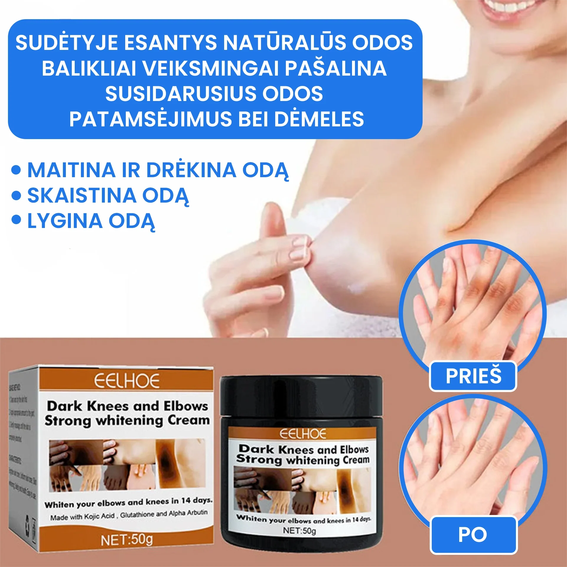 Efektyvus odos spalvos pakitimas. Dėl įvairių aplinkos ar organizmo veiksnių kartais susiduriame su patamsėjusiomis odos vietomis: alkūnės, keliai, bikinio linijos ir kt. Šio kremo sudėtyje yra odą šviesinančių veikliųjų medžiagų ir natūralių ingredientų, kurie skaistina šių sričių spalvą.