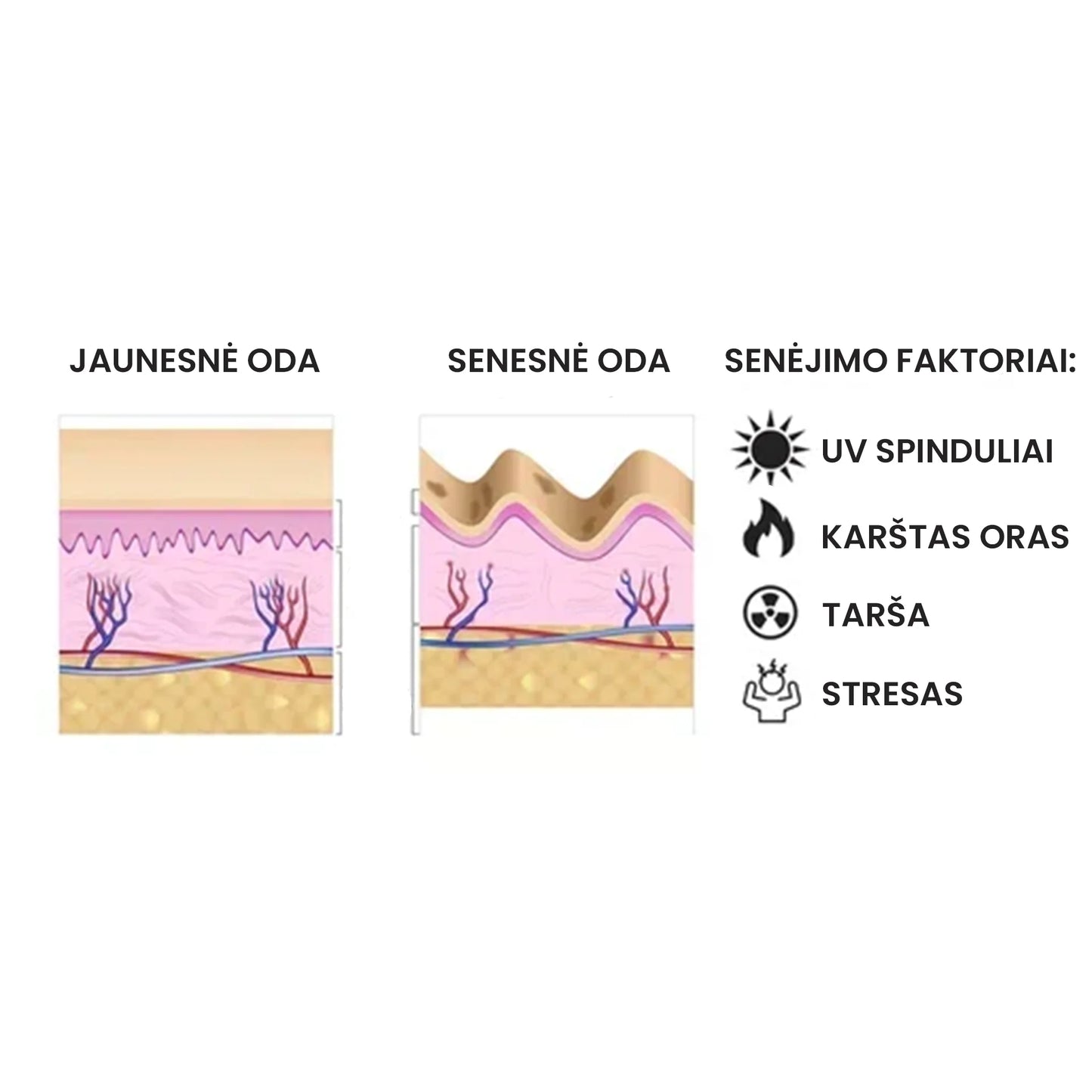 - Dėl veido odos senėjimo mažėja kolageno ir elastino baltymų, todėl odoje atsiranda raukšlių, kuriuose kaupiasi per dieną sukaupti nešvarumai ir bakterijos, o visa tai turi kenksmingos įtakos spindinčios odos išvaizdai;