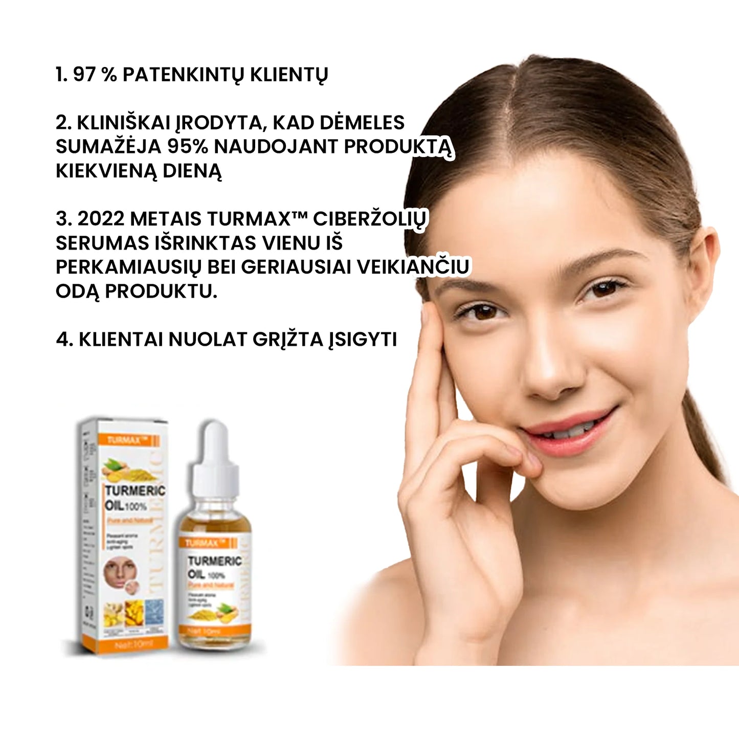 - TurmaX™ ciberžolės serumas yra idealus sprendimas kovoti su ankstyvo senėjimo požymiais. Produktas pagamintas iš ekologiškų ingredientų ir pažangių technologijų, jis stimuliuoja svarbiausių baltymų gamybą ir palaiko odos stangrumą. Užkerta kelią odos suglebimui, naikina esančias ant odos dėmeles. Serumas atgaivina odą ir atkuria natūralų jos spindesį.