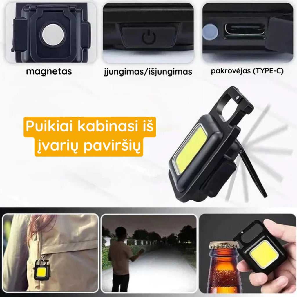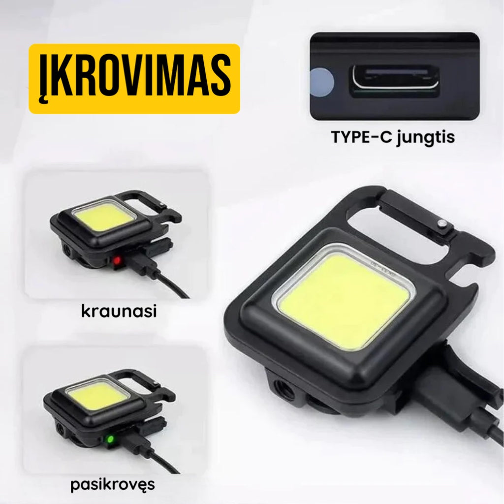 Galingas apšvietimas - šis mini raktų žibintuvėlis turi COB lempos rutuliukus, galinčius skleisti stulbinančią 500 liumenų šviesą. Be to, jis turi C tipo USB įkrovimo jungtį, todėl jį galite įkrauti bet kuriuo maitinimo šaltiniu, turinčiu USB jungtį.