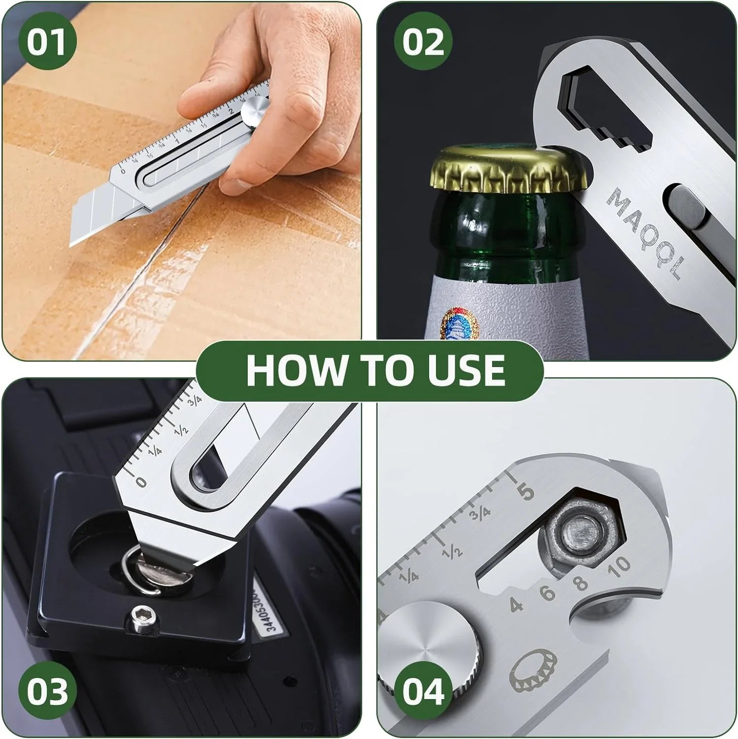 Daugiafunkcinis įrankis, kuris gali ne tik pjauti, bet prisukti ir atsukti varžtus bei išmatuoti reikiamą atstumą liniuotės pagalba. Įrankis gali atidaryti butelio kamštuką;