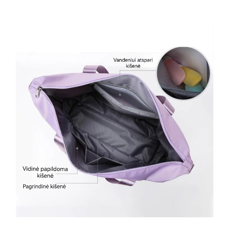 - Didelio tankio vandeniui atspari medžiaga gali padėti atskirti sausus ir šlapius daiktus. Jei turite šlapius drabužius ar rankšluostį, galite drąsiai dėti juos į šį krepšį.