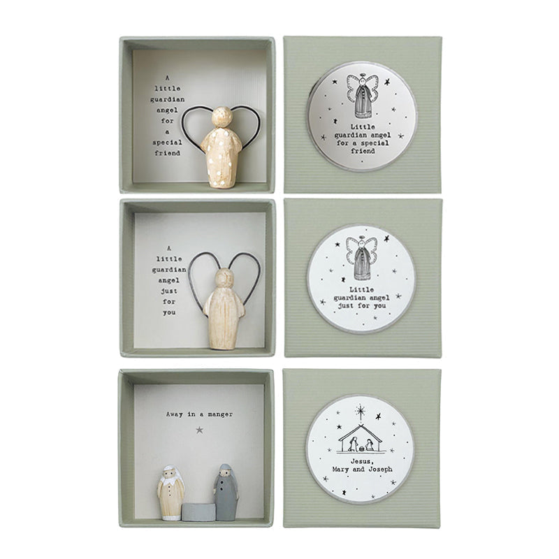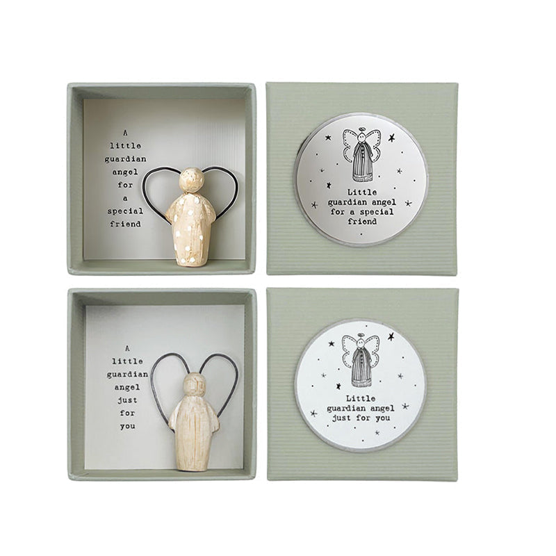 - Asmeninis prisilietimas: Nedidelė medinė angelo figūrėlė su elegantiškais siūlų sparnais ir užrašu „Mažas angelas sargas ypatingam draugui“.