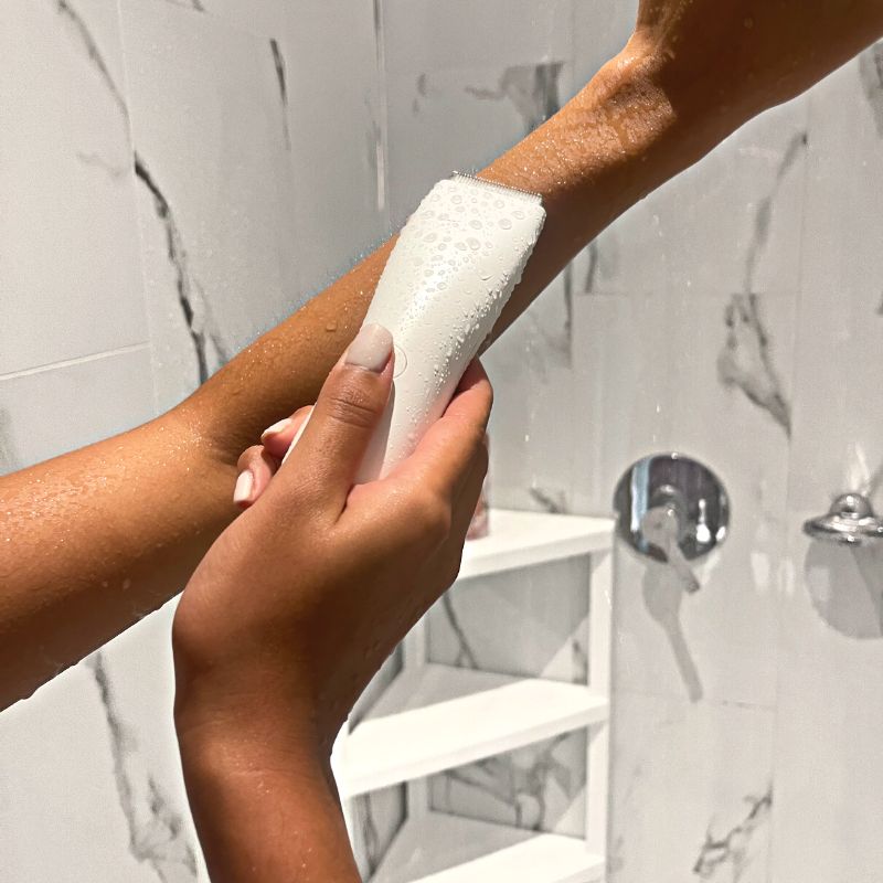 - Skutant plaukelius galima naudoti specialų skutimosi kremą arba tiesiog skusti plaukelius bėgant vandens srovei. Ergonomiška skustuvo rankena leidžia patogiai prietaisą paimti į rankas. Rekomenduojama po naudojimo išvalyti skustuvo vidų su rinkinyje esančiu šepetėliu.