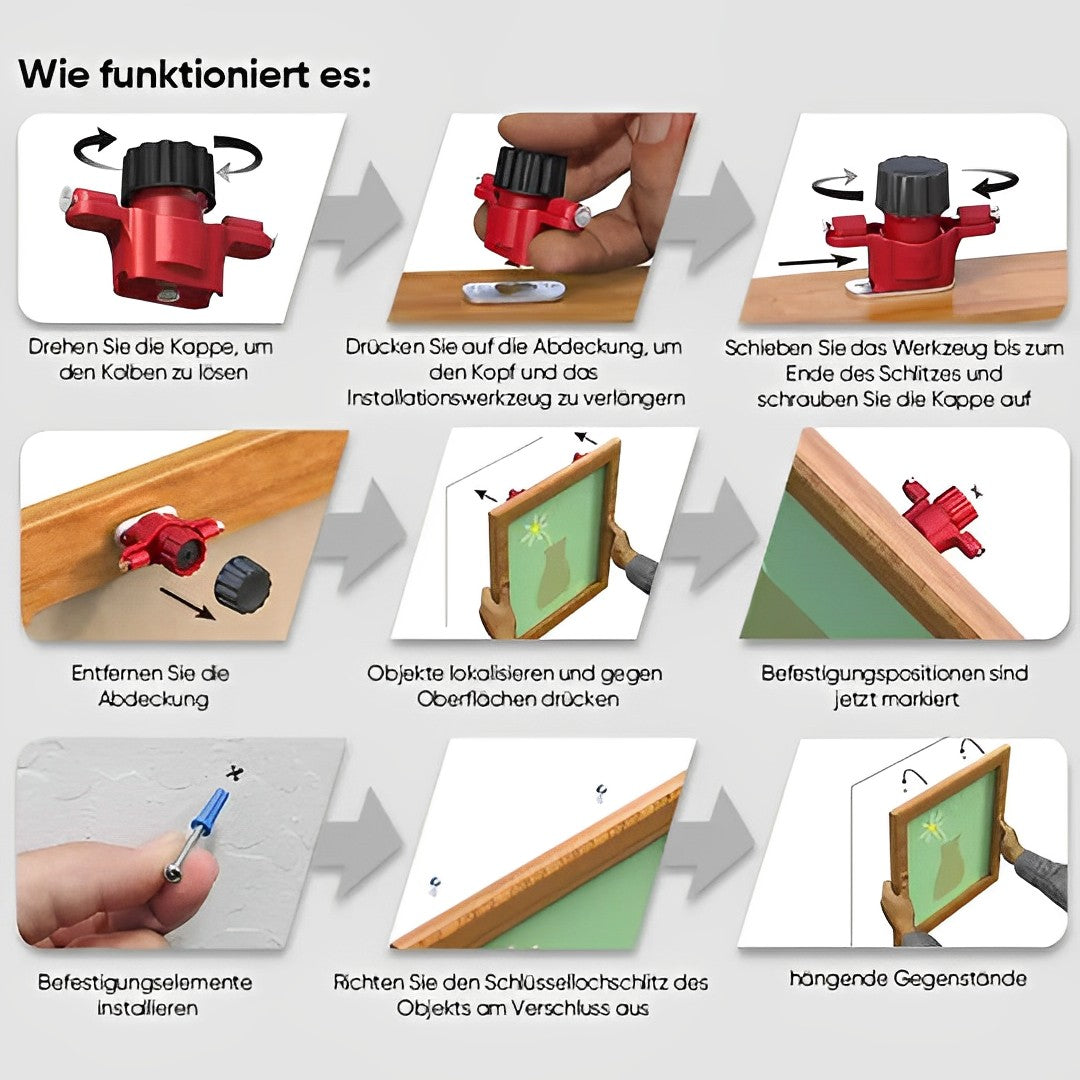 - Žymeklis idealiai tinka montuojant lentynas, veidrodžius, paveikslus ar kitus daiktus ant sienų. Tai nepakeičiamas įrankis, kuris padeda išvengti gręžimo klaidų! Žymekliu gali naudotis tiek įgudę, tiek pradedantieji meistrai.