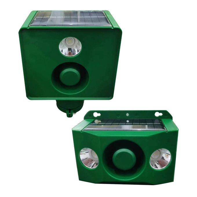 - Prietaisas skleidžia įvairių gyvūnų, šautuvų garsus, kurie atgraso svetimus gyvūnus ateiti į jūsų kiemo teritoriją. Garsiniai prietaisai yra dažnai naudojami siekiant apsaugoti sodus, daržus, ūkius nuo kenkėjų. Prietaisas turi LED prožektorius, kurie taip pat kartu šviečia skleidžiant garsiniam signalui.