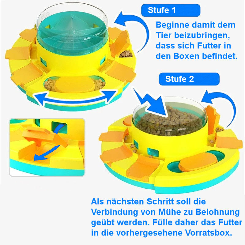 Įdėjus į dubenėlį maisto, augintinis turės spustelti letėnele skaidrų dangtelį ir maistas, tik tuomet išbirės į dubenėlio esančius stalčiukus. Dubenėlio stalčiukuose maisto bus paskirstyta po mažomis porcijomis, taip augintinis išmoks mėgautis maistu ir valgyti iš lėto;