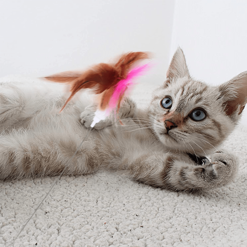 - Interaktyvų žaislą sudaro trys dalys - 7 vnt. lengvų ir spalvotų plunksnų, lazdelė bei apykaklė. Lazdelė pagaminta iš storo plieno ir pasižymi ypatingu lankstumu ir tvirtumu. Apykaklė pagaminta iš aukštos kokybės silikono, kuris yra lengvas, atsparus įbrėžimams bei įtrūkimams.