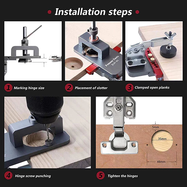 - Veikia su 3 mm, 4 mm, 5 mm, 5 mm, 6 mm vyrių nuokrypiais. Efektyvūs ir patogūs įrankis gręžti skylės stalčiams, durims, spintoms, virtuvės spintelėms, vonios spintelėms ir t.t.