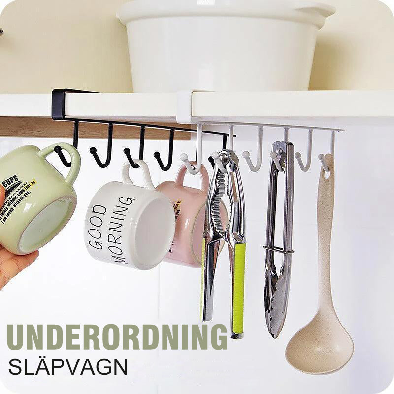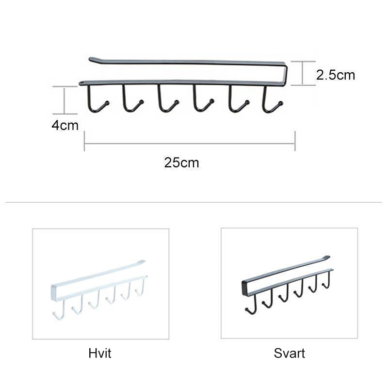 - Kabliukai skirti patogiam ir tvarkingam puodelių, įrankių bei kitų daiktų laikymui užtikrinti. Šią pakabą galima lengvai uždėti ant virtuvėje esančios spintos lentynėlės ar durelių.