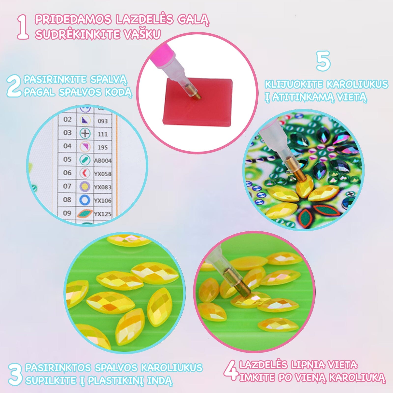- Klijuokite karoliukus į atitinkamą vietą (orientuotis taip pat padeda spalvoms priskirtos raidės);