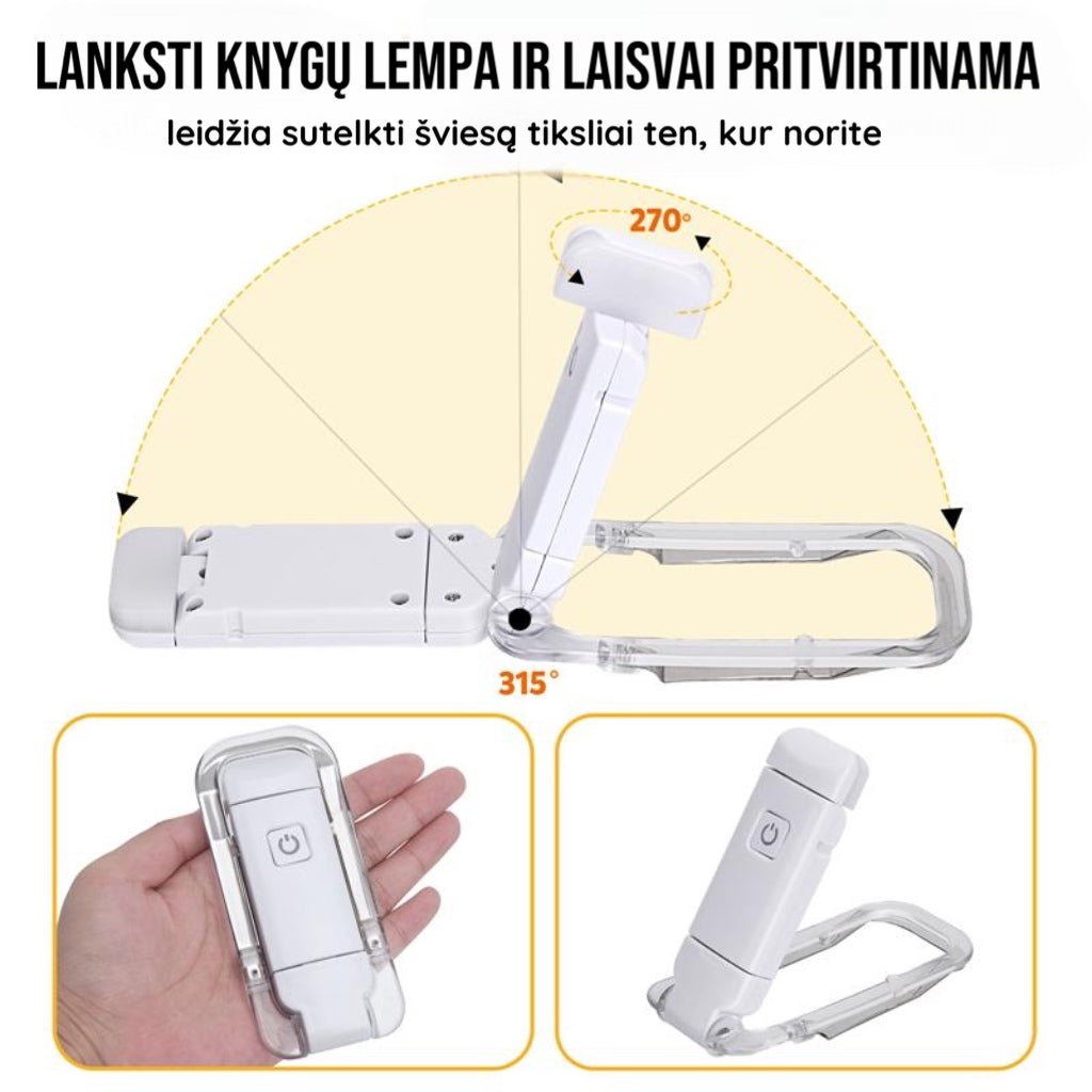 Kompaktiškas ir lengvas - mini dydžio dizainas, mažas ir lengvas, idealiai tinka prisegti prie knygos skaitant naktį. Lempa gali būti visiškai sulankstyta plokščia ir plona, naudojama kaip dvigubas knygos skirtukas, nešiojamas skaityti lėktuve, traukinyje ar ant galinės automobilio sėdynės keliaujant.