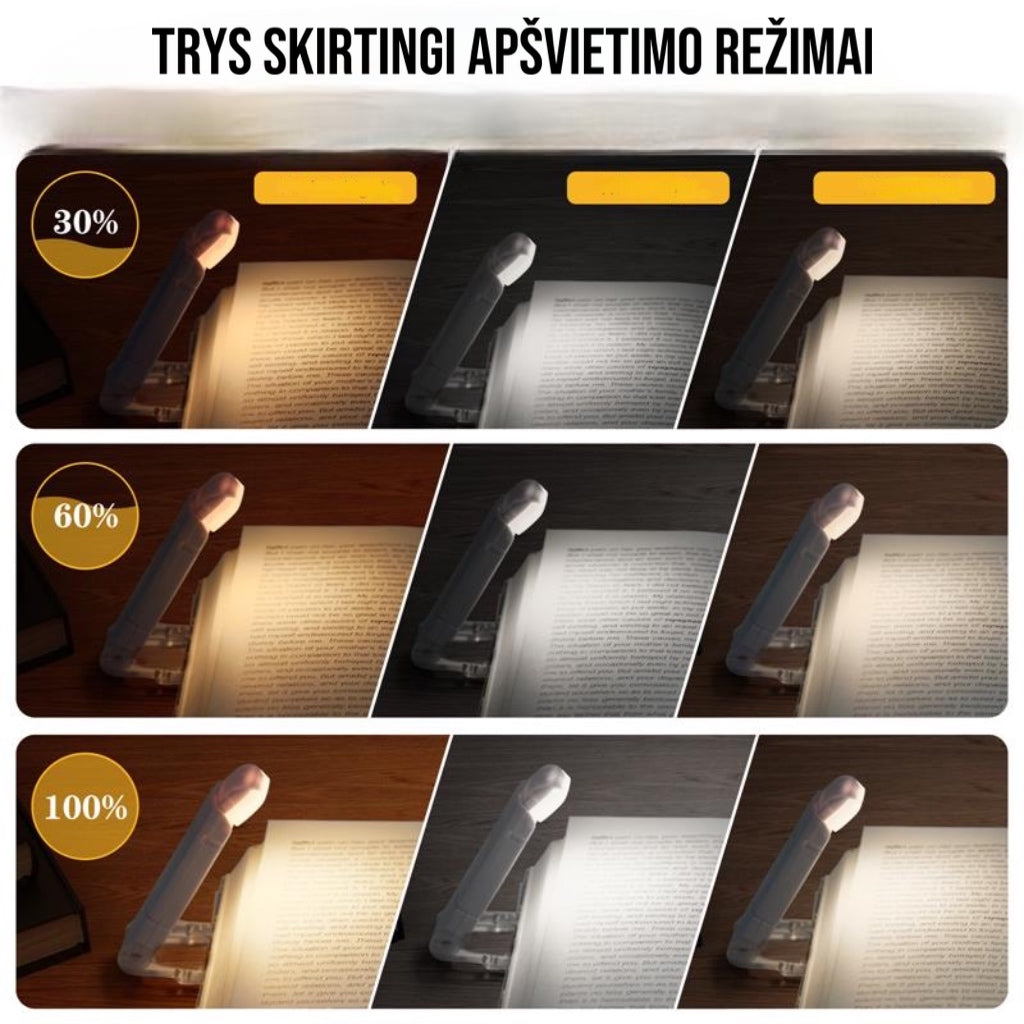 3 ryškumo ir 3 reguliuojamos temperatūros režimai - švelnus baltas švytėjimas, paspauskite mygtuką, kad sureguliuotumėte 9 režimų šviesą: 0-100 % ryškumas ir reguliuojama šviesos temperatūra (šilta, balta, gintarinė), neakinantis švelnus švytėjimas padeda aistringiems skaitytojams mėgautis skaitymu nevarginant akių.