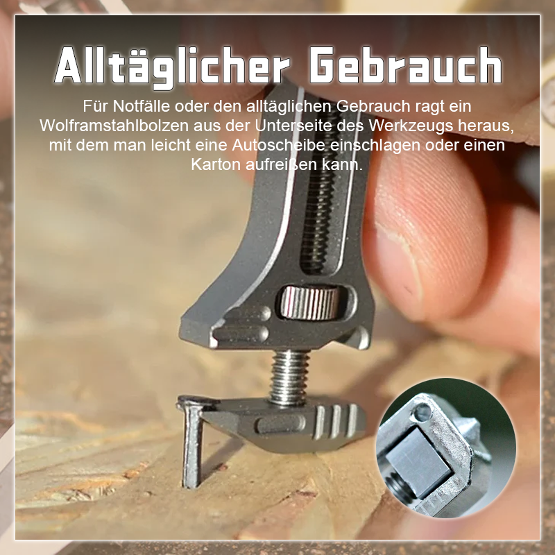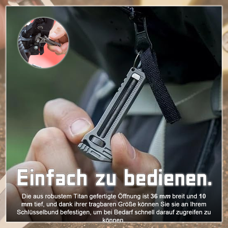 - Įrankis pagamintas iš aukštos kokybės titano lydinio. Yra lengvas, nedidelio dydžio bei pasižymintis ilgaamžiškumu. Įrankis turi veržliaraktį, kuris išsiplėčia iki 36 mm pločio bei 10 mm gylio. Įrankį galima nešiotis su savimi, jis lengvai tvirtinasi prie raktų pakabuko, kelnių diržo sagties bei kuprinės užtrauktuko.