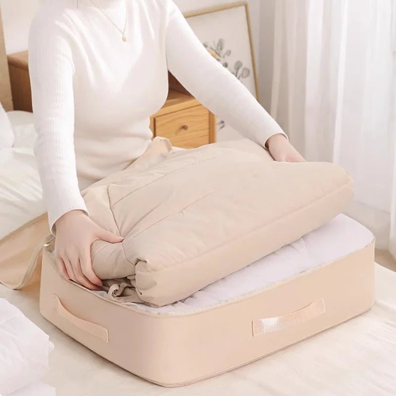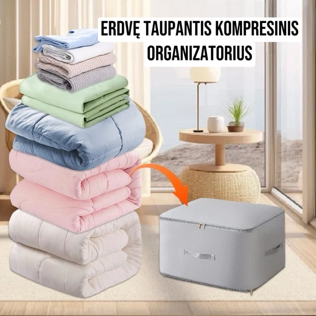 Šis kompresinis organizatorius – idealus sprendimas tvarkai ir erdvės taupymui. Jis leidžia sutaupyti iki 40% daugiau vietos jūsų kambaryje arba lagamine, be vakuumo.