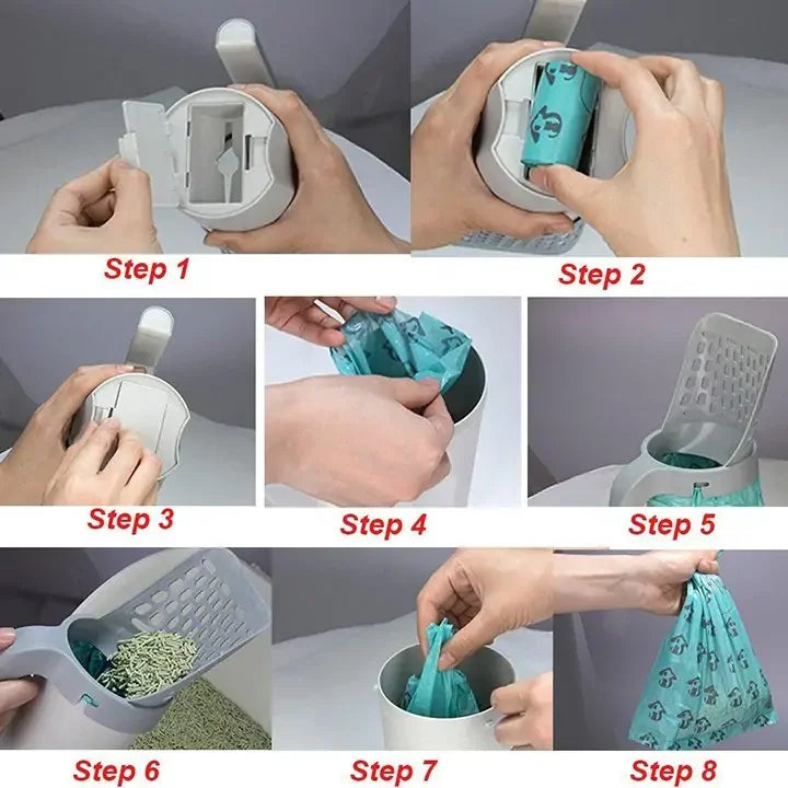 Kačių kraiko samtelio + šiukšliadėžės + šiukšlių maišelio derinys palengvina valymą ir leidžia jį atlikti viena ranka.