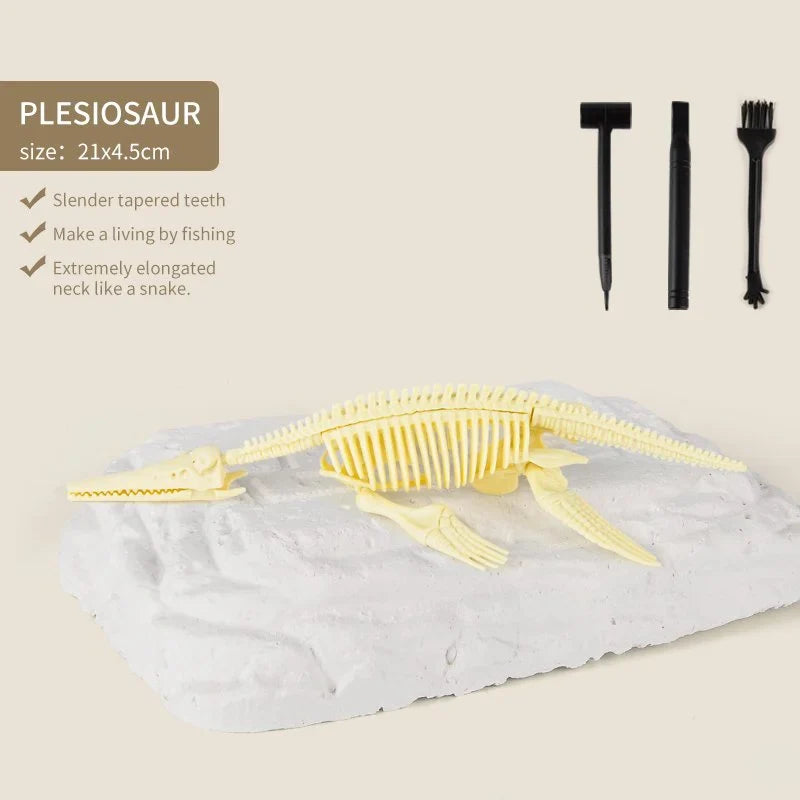 - Rinkinyje yra smulkūs akmens masei skirti skaldyti įrankiai. Vaikai turės iškasti kiekvieną dinozauro kauliuką. Užsiėmimo metu yra lavinama vaikų vaizduotė, kūrybiškumas, smulkiosios motorikos įgūdžiai;