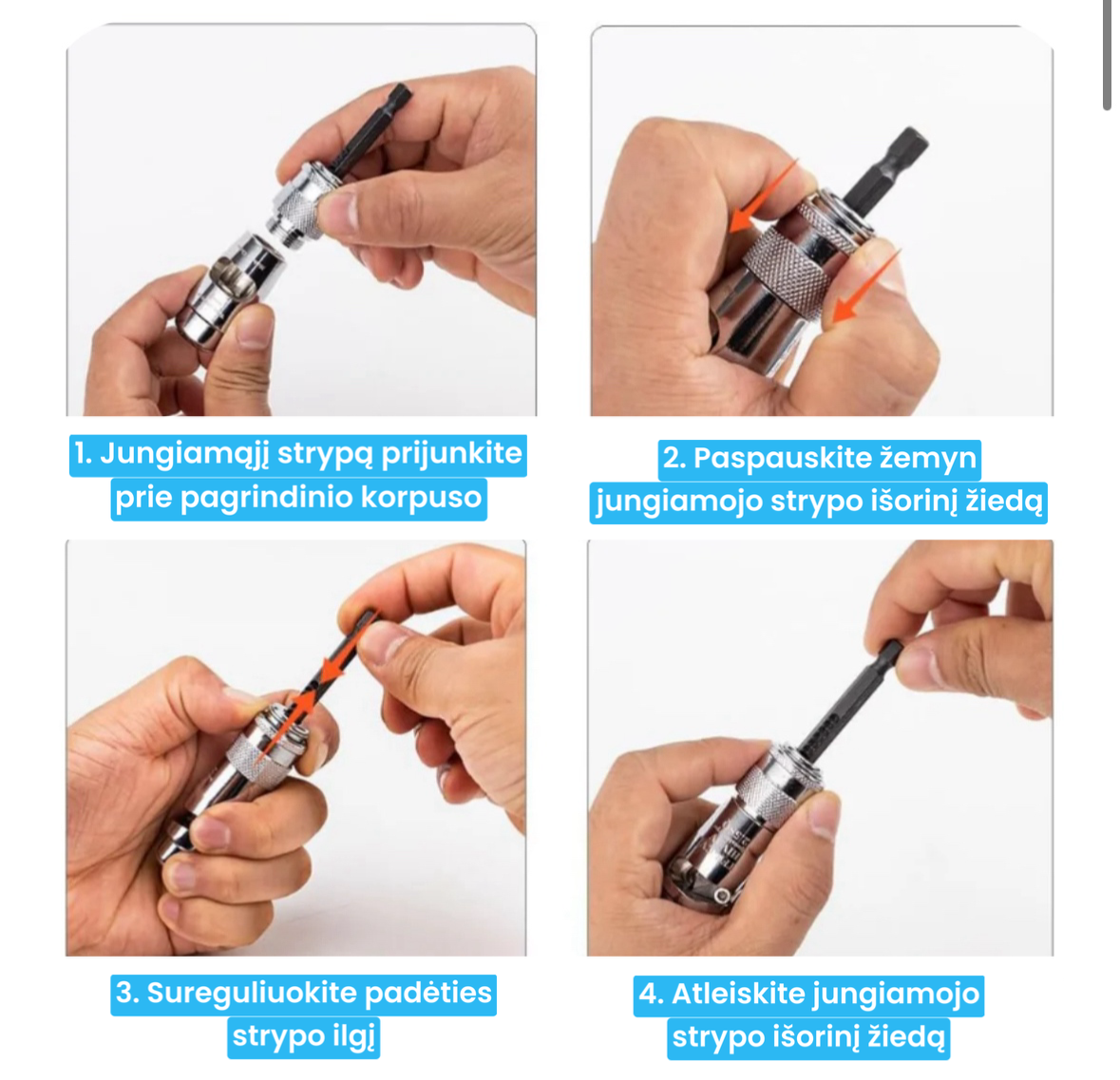 Lengva naudoti - įrankiai suderinami su elektriniais gręžtuvais, turi lengvai nuimamas dalis, kad būtų galima greitai reguliuoti.