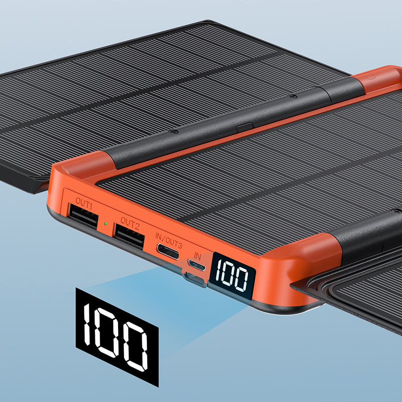 Su trimis saulės panelėmis, ši saulės energijos banko įranga užtikrina patikimą energijos šaltinį, kad galėtumėte įkrauti savo įrenginius net tada, kai esate už miesto ribų ir nepriklausote nuo elektros tinklų.
