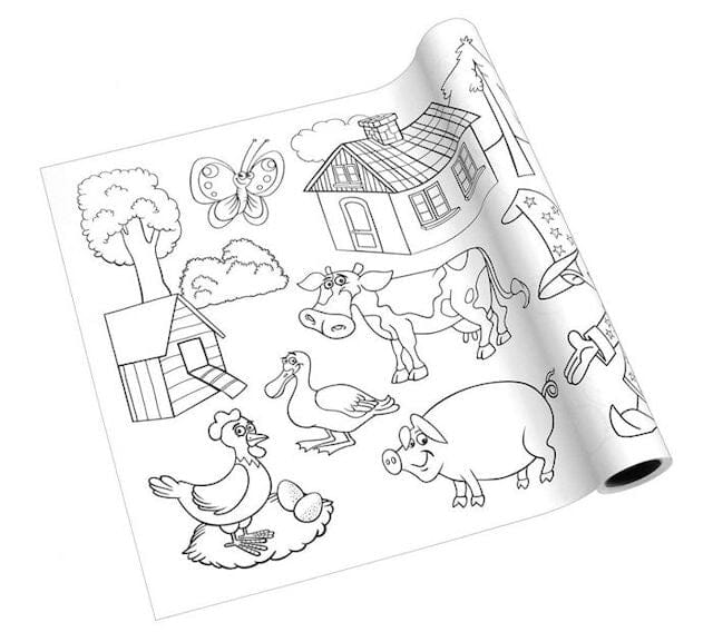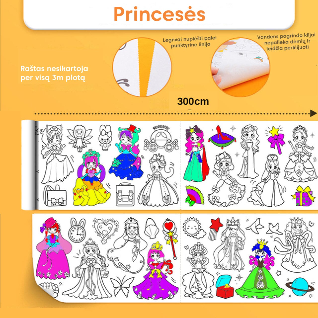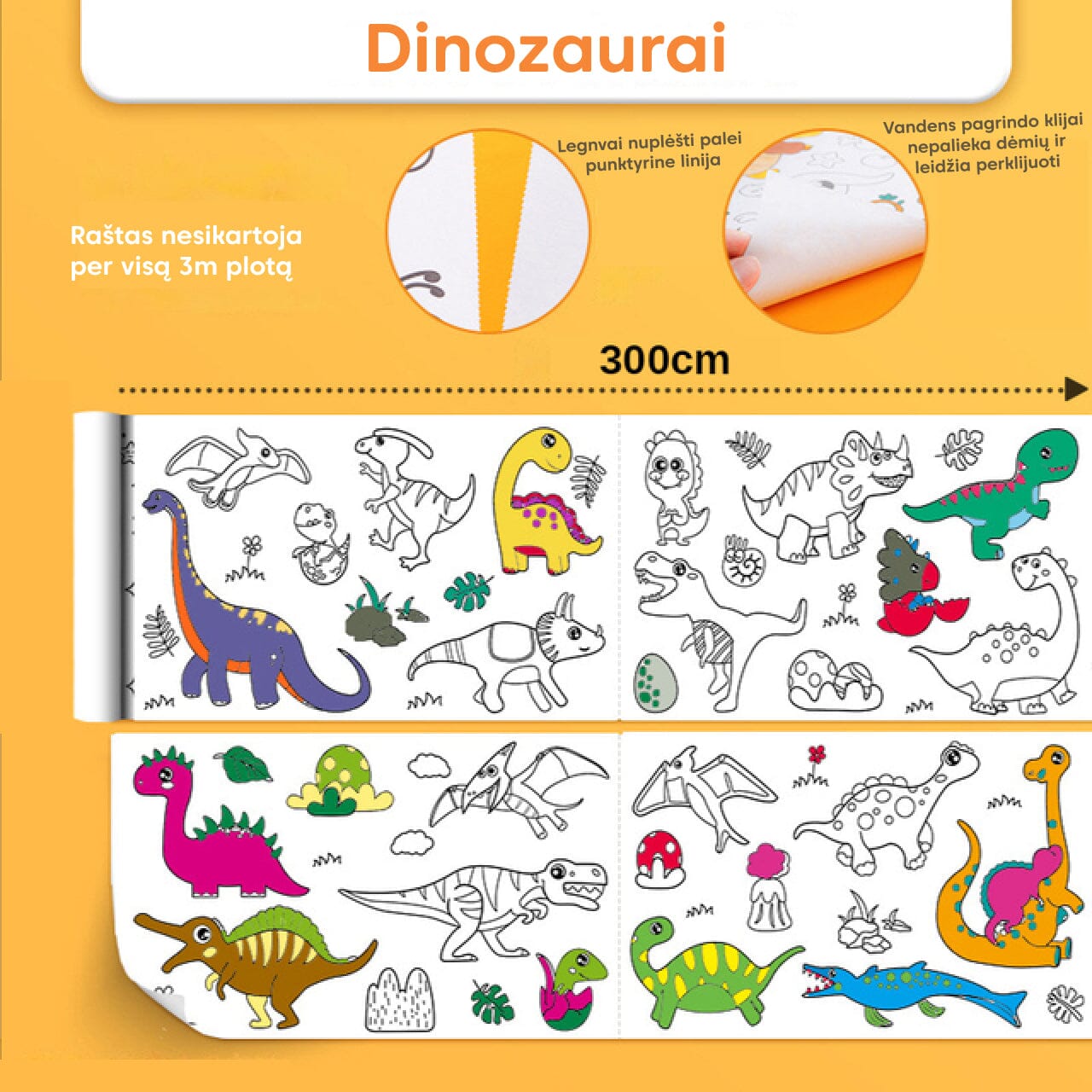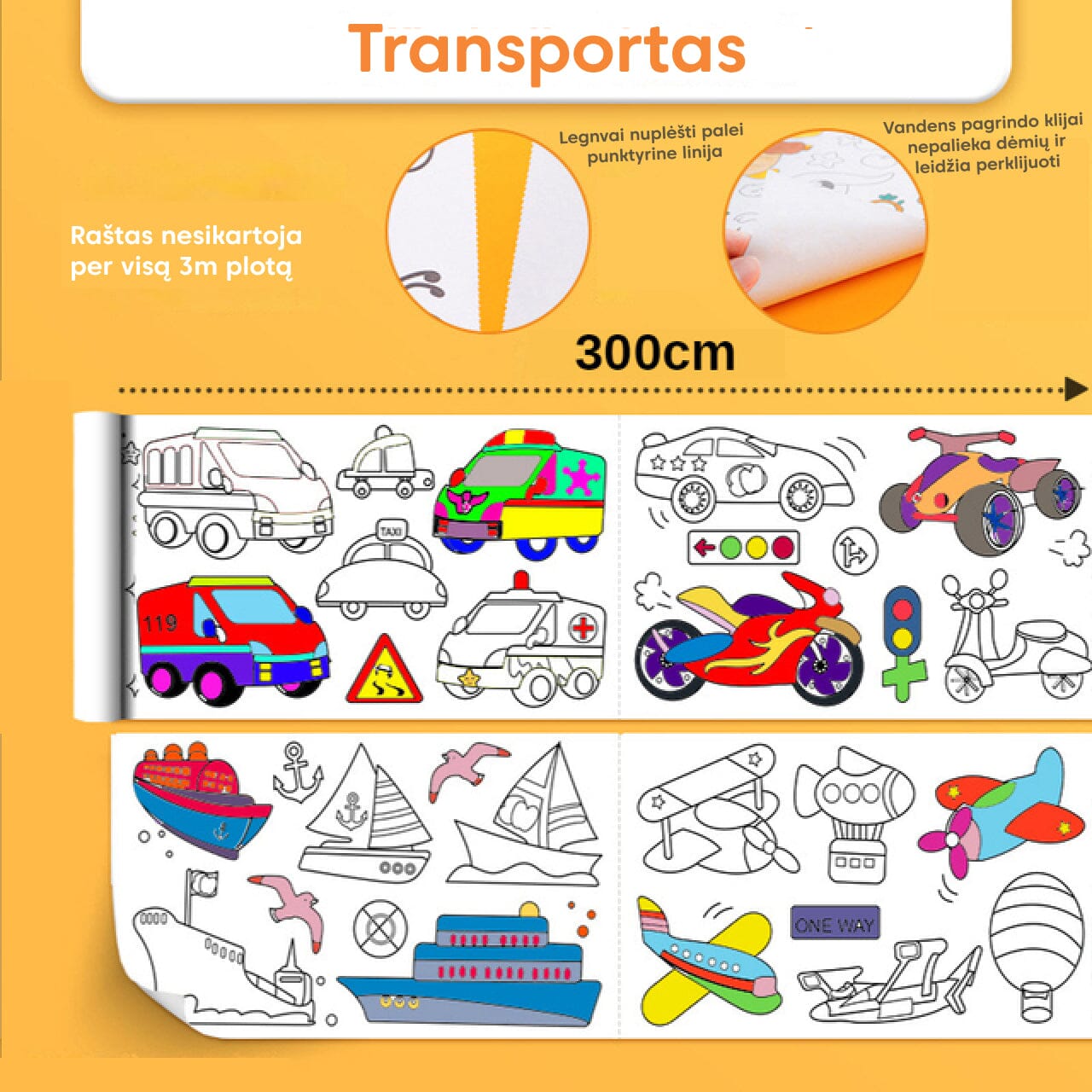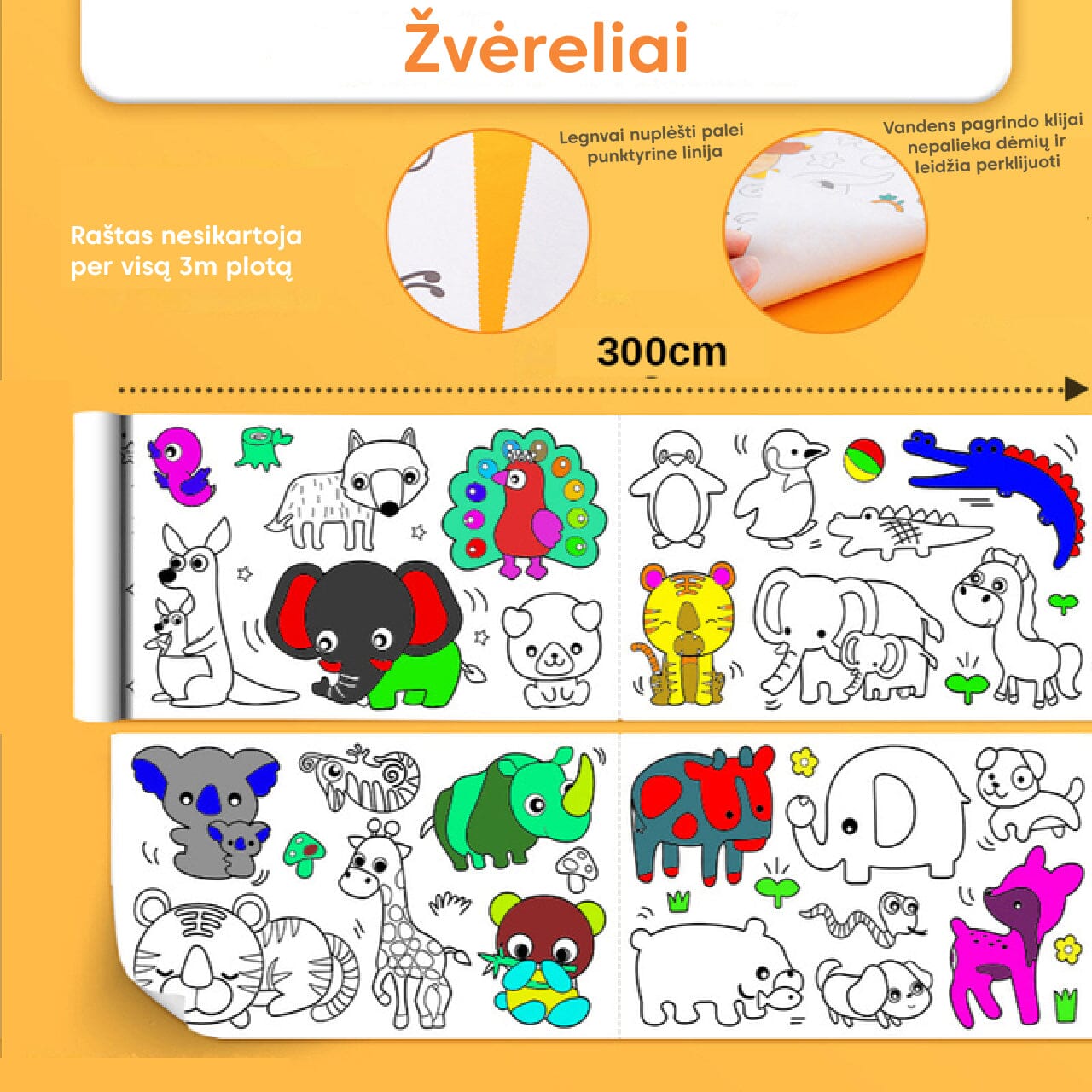 Lipnus spalvinimo ritinys su paveikslėliais. Puikiai tinka vaikų kūrybai ir vaikų kambario dekoravimui - visą ruloną galima užklijuoti ant sienos piešti arba nupieštą ir nuspalvintą paveiksliuką iškirpti ir užklijuoti norimoje vietoje.