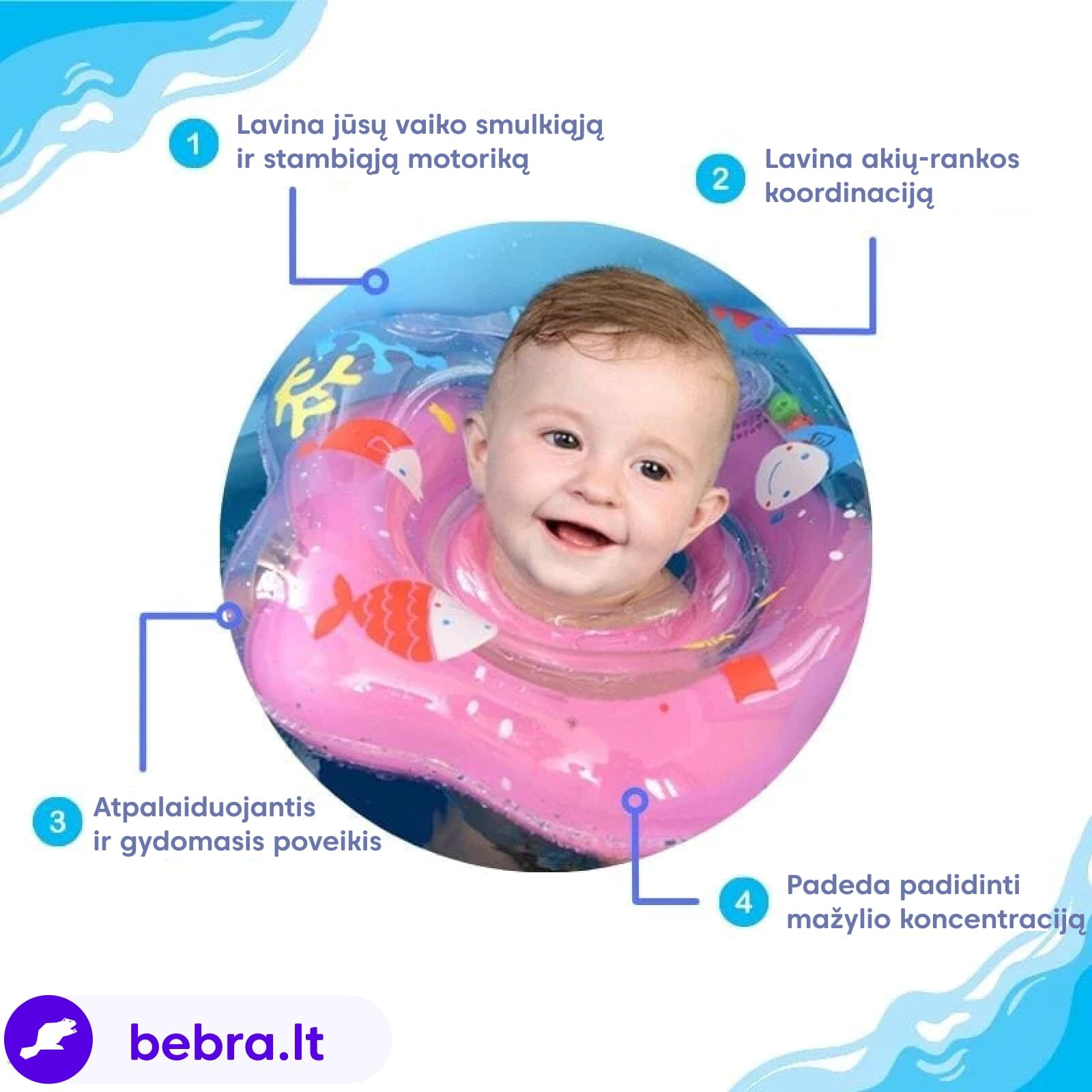 - Puikiai tinka 1–24 mėnesių vaikams: Supažindinkite juos su didžiuliu linksmumu spardytis vandenyje ir braidyti! Reikšmingas pranašumas dar prieš nemokant šliaužioti ar vaikščioti.