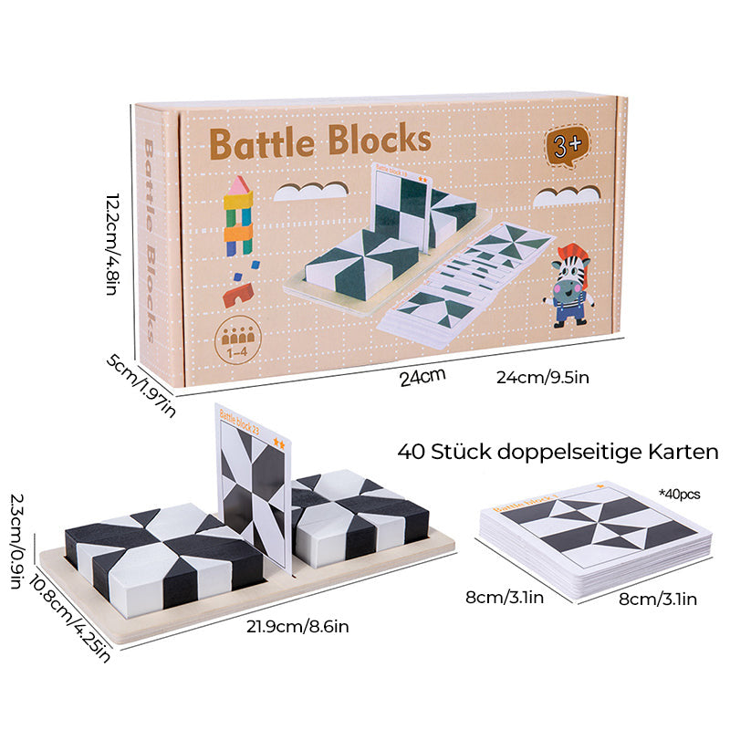 99 kortelėse yra vaizduojami skirtingi kaladėlių sudėjimo būdai. iš viso yra 16 medinių blokelių, iš jų - 8 trikampio formos bei 8 trapecijos formos. Žaidimas puikiai tinka vaikams ir suaugusiems.