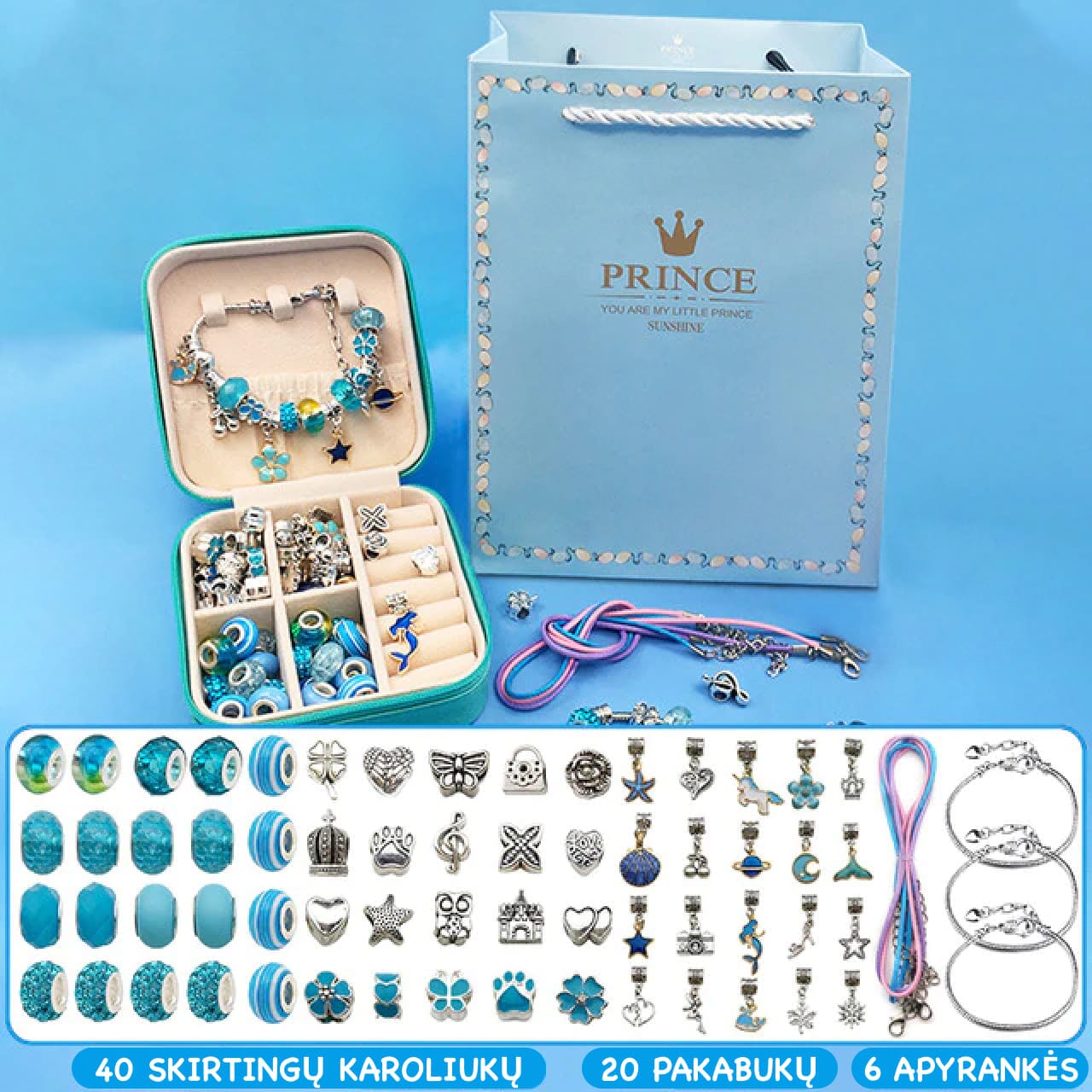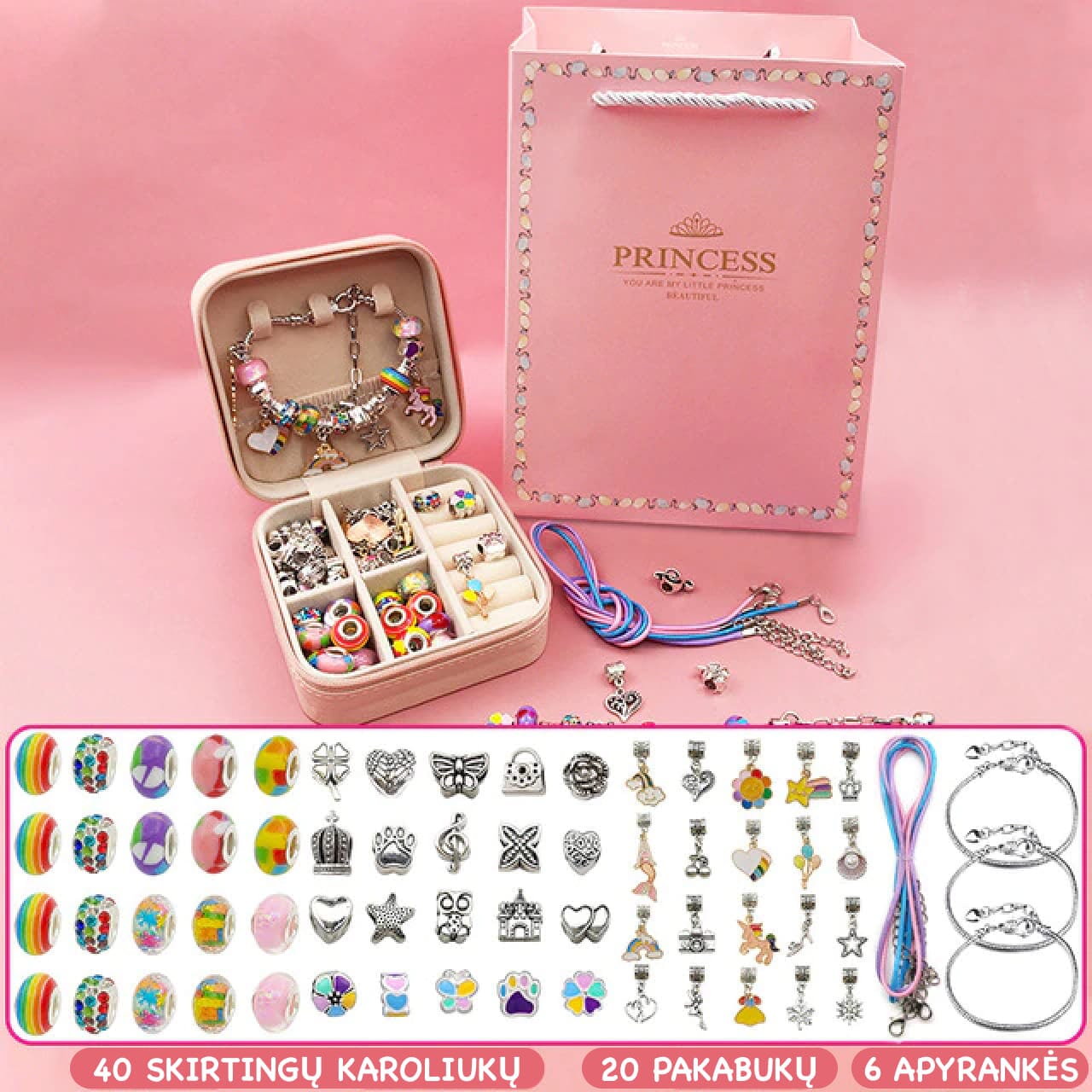 Šis apyrankės rinkinys yra puiki dovana mergaitei įvairiom progom. Mergaitės akimirksniu susižavės dideliu karoliukų ir pakabukų pasirinkimu.