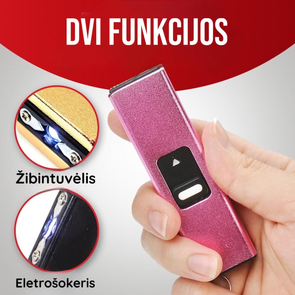 Aukšta įtampa užpuoliką šokiruoja elektrošoku. o galingas įmontuotas LED žibintuvėlis apšviečia tamsiausią kampą.