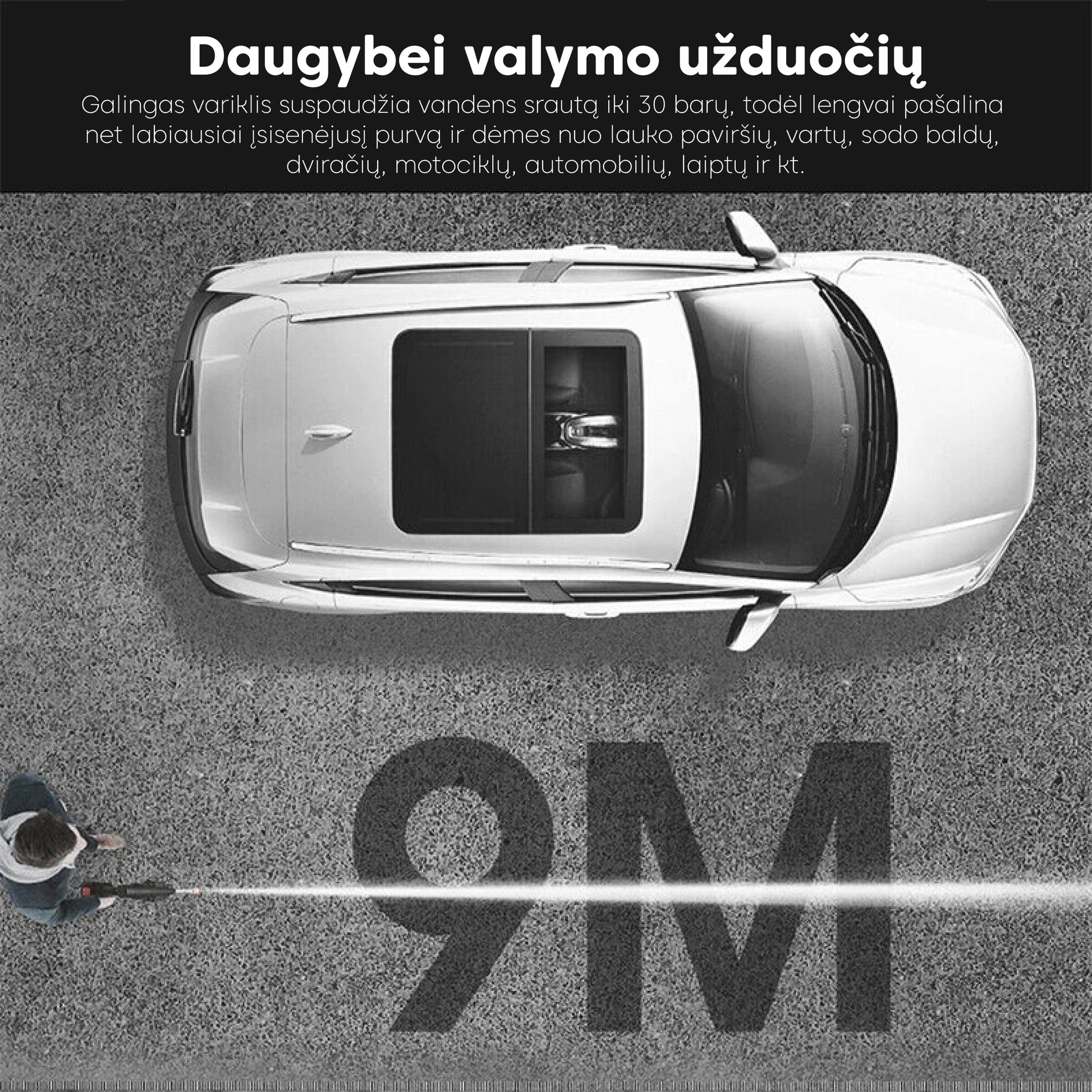 - Galingas variklis suspaudžia vandens srautą iki 30 barų, todėl lengvai pašalina net labiausiai įsisenėjusį purvą ir dėmes nuo lauko paviršių, vartų, sodo baldų, dviračių, motociklų, automobilių, laiptų ir kt.
