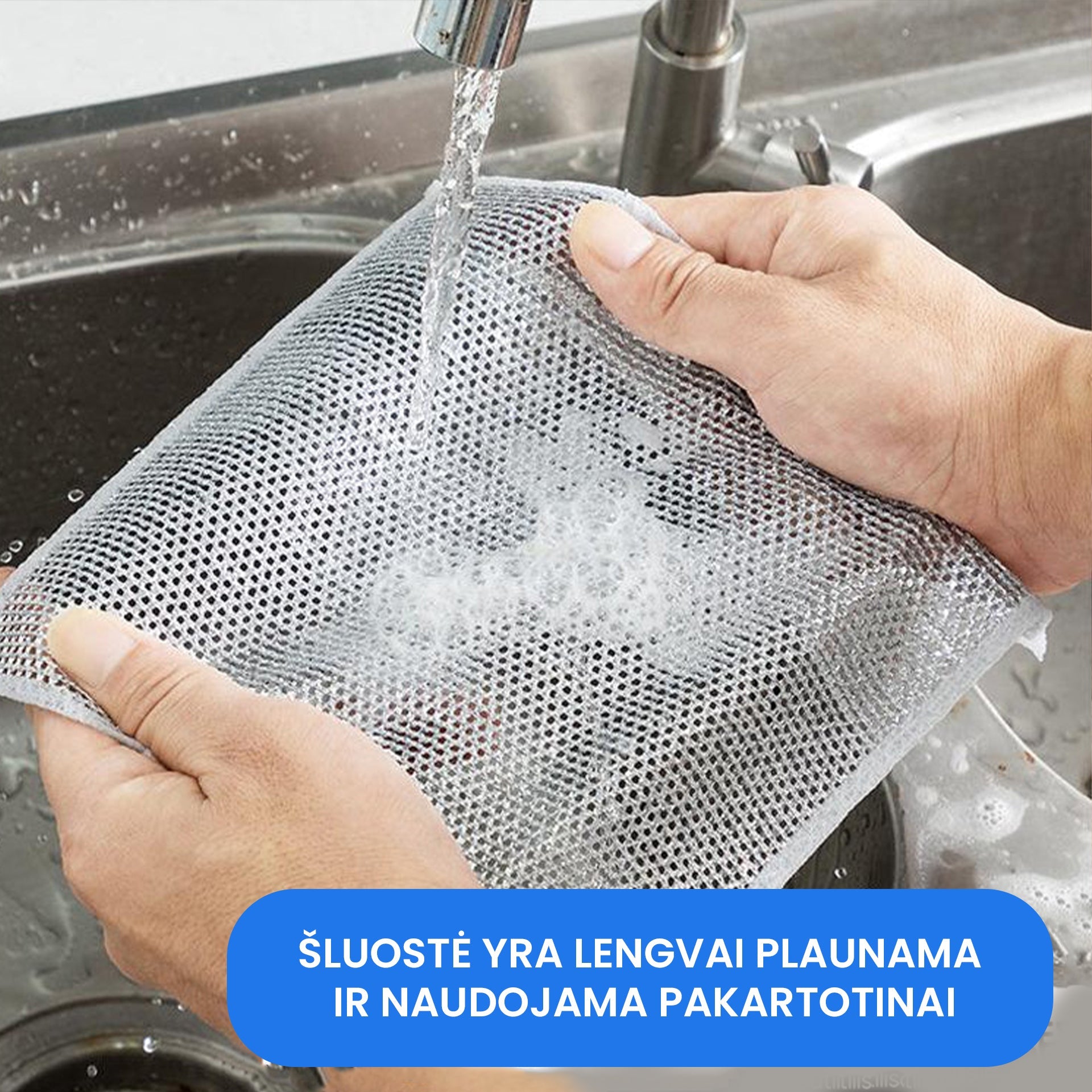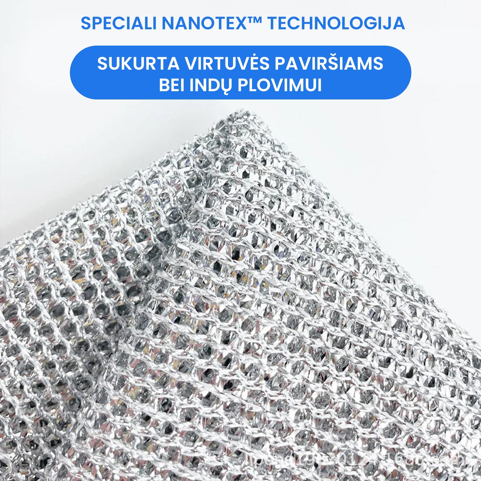 - Nanotex™ šluostė yra lengvai plaunama ir naudojama pakartotinai. Tinklinio audinio dėka šluostėje nepasilieka maisto likučių, todėl jos neskleidžia nemalonaus kvapo bei užtikrina higienišką švarą virtuvėje. Kokybiškai apsiūti šluostės kraštai neleidžia suirti tinkleliui, todėl šluostes galima drąsiai skalbti ir vėl naudoti.
