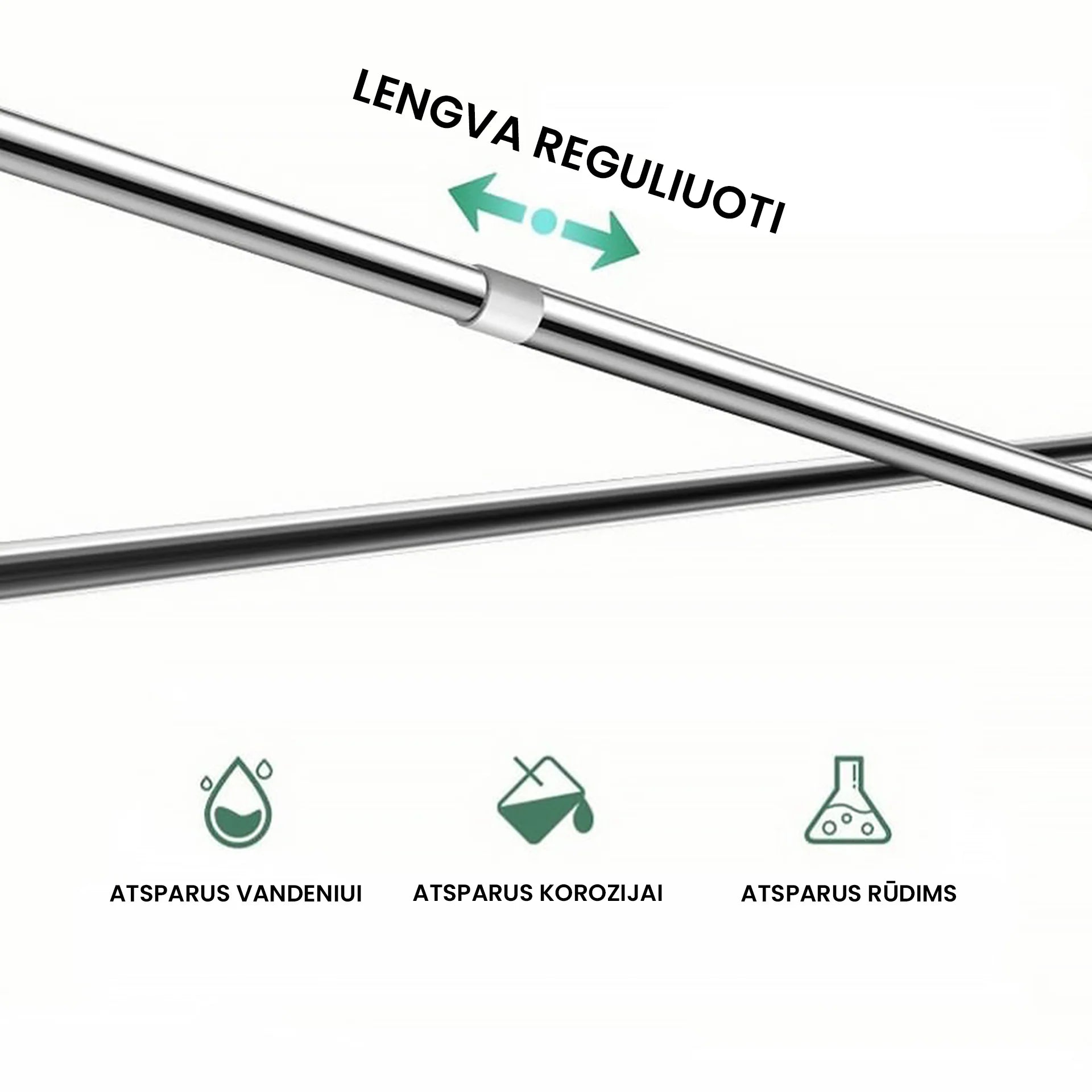 - Tvirtas, aukštos kokybės nerūdijantis plienas. Drabužių turėklas pagamintas iš aukščiausios kokybės nerūdijančio plieno medžiagų. Yra atsparus korozijai ir rūdims. Pasižymi ilgaamžiškumu ir patvarumu. Neslystantys guminiai turėklo galai leidžia tvirtai įstatyti tarp sienų turėklą užtikrindami stabilų drabužių išlaikymą.