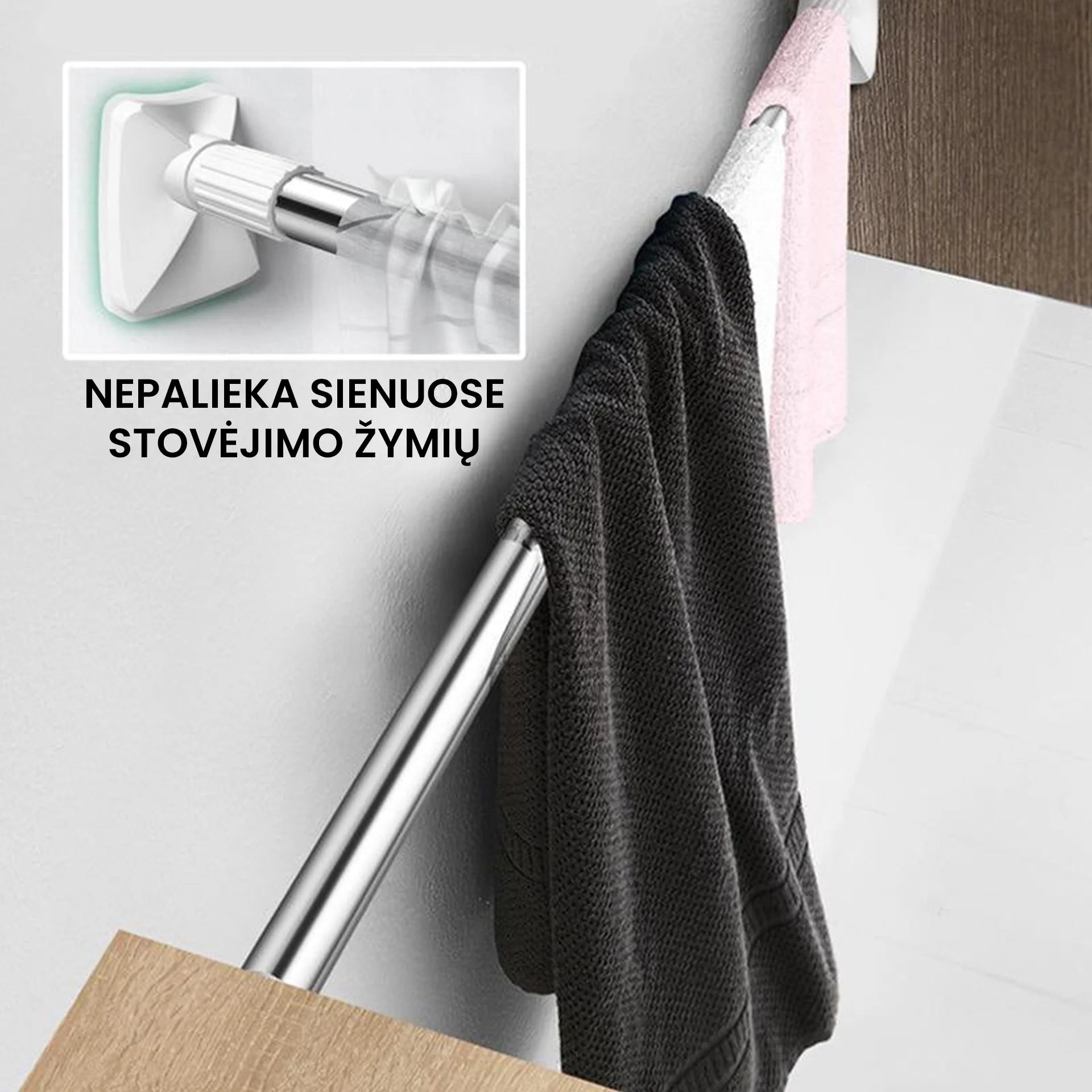 - Paprasta įstatyti turėklą. Itin paprasta ir lengva įstatyti turėklą tarp sienų ar Jūsų esančioje spintoje. Lengva reguliuoti, pasukti bei prireikus suskleisti turėklą ir pernešti į kitą vietą.