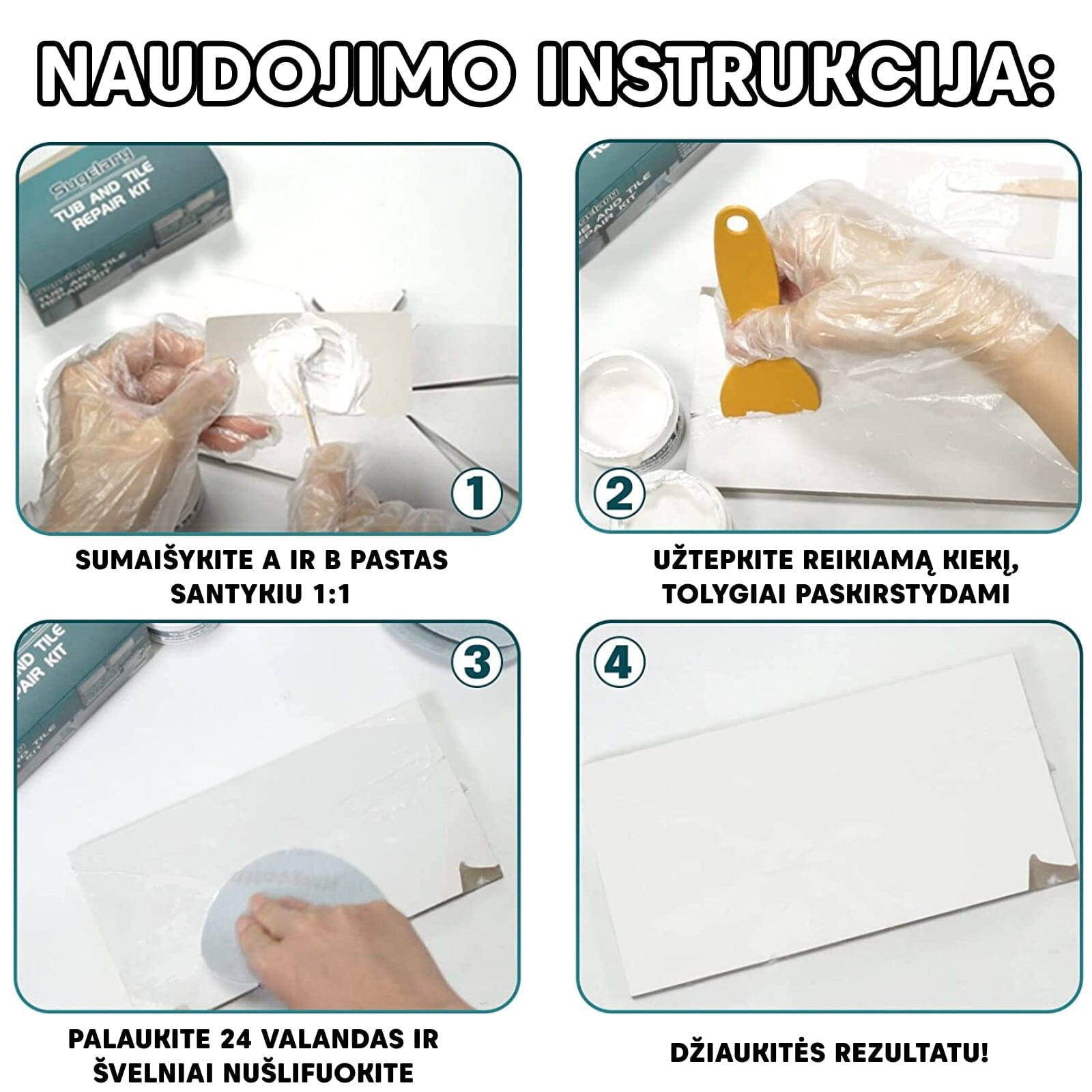 Lengva naudoti ir nereikia jokios patirties! Tereikia gerai išmaišyti ir užtepti ant pažeistos vietos, palaukti, kol visiškai sukietės, tada lygiai nušlifuoti.