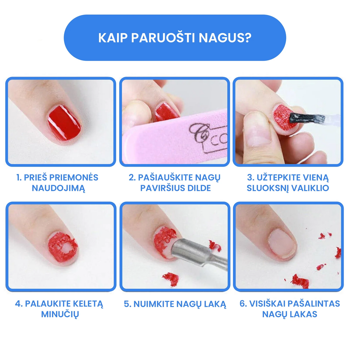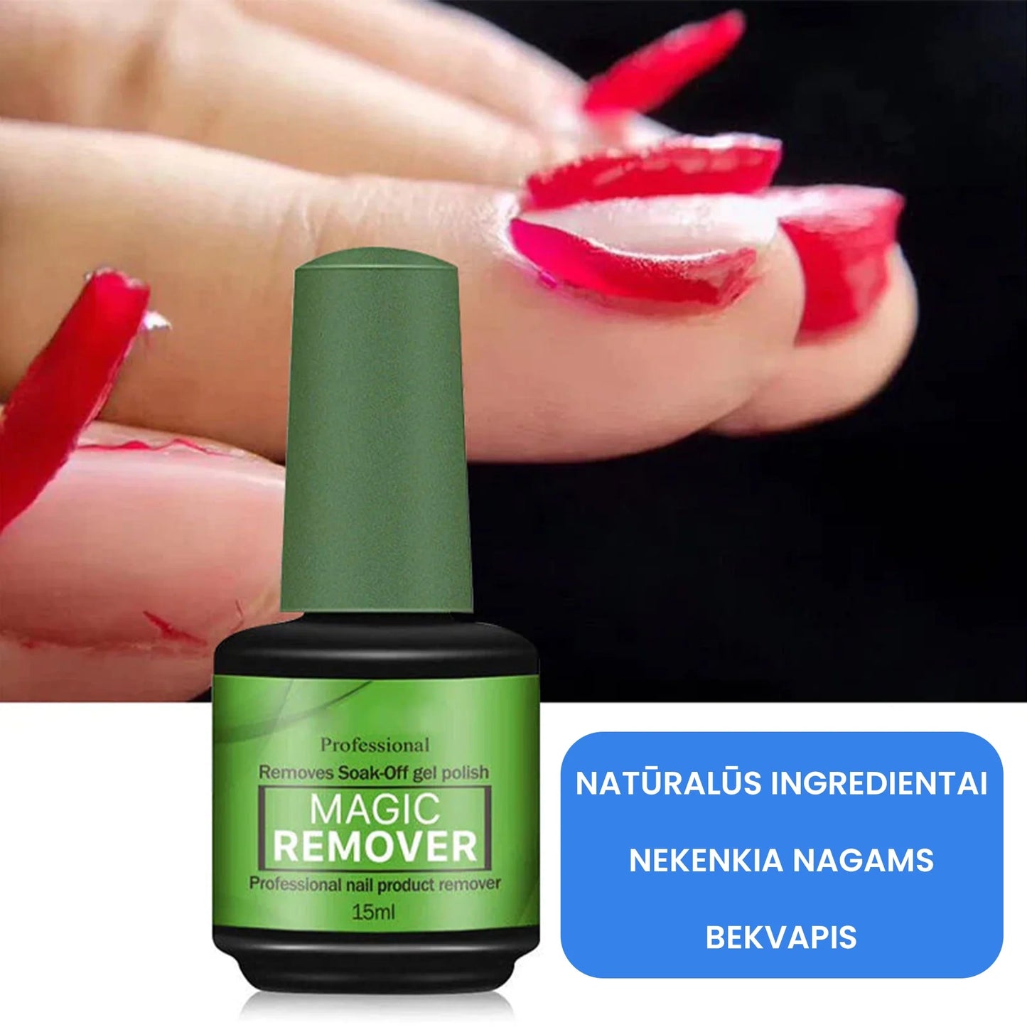 - Lengva naudoti! Užtepkite valiklio ant nago ir luktelėkite porą minučių. Stebėkite kaip nagų lakas atšoksta nuo nago plokštelės!
