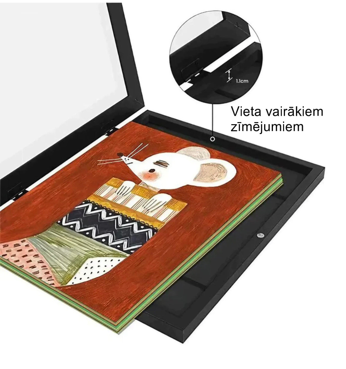 Tai idealus pasirinkimas tėvams, norintiems eksponuoti savo vaiko meno kūrinius neužimant daug erdvės. Tai gali padidinti jų savivertę ir paskatinti toliau tyrinėti savo meninius gebėjimus. Be to, jį galima kabinti tiek vertikaliai, tiek horizontaliai, todėl suteikiama daugiau galimybių eksponuoti unikalų meną!