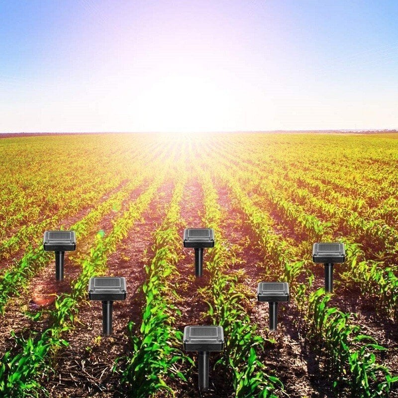 🌞 SUKURTAS DIDELIOMS ERDVĖMS - Plati aprėptis: saulės energija varomas garsinis kenkėjus atbaidantis prietaisas spinduliuoja visomis kryptimis.