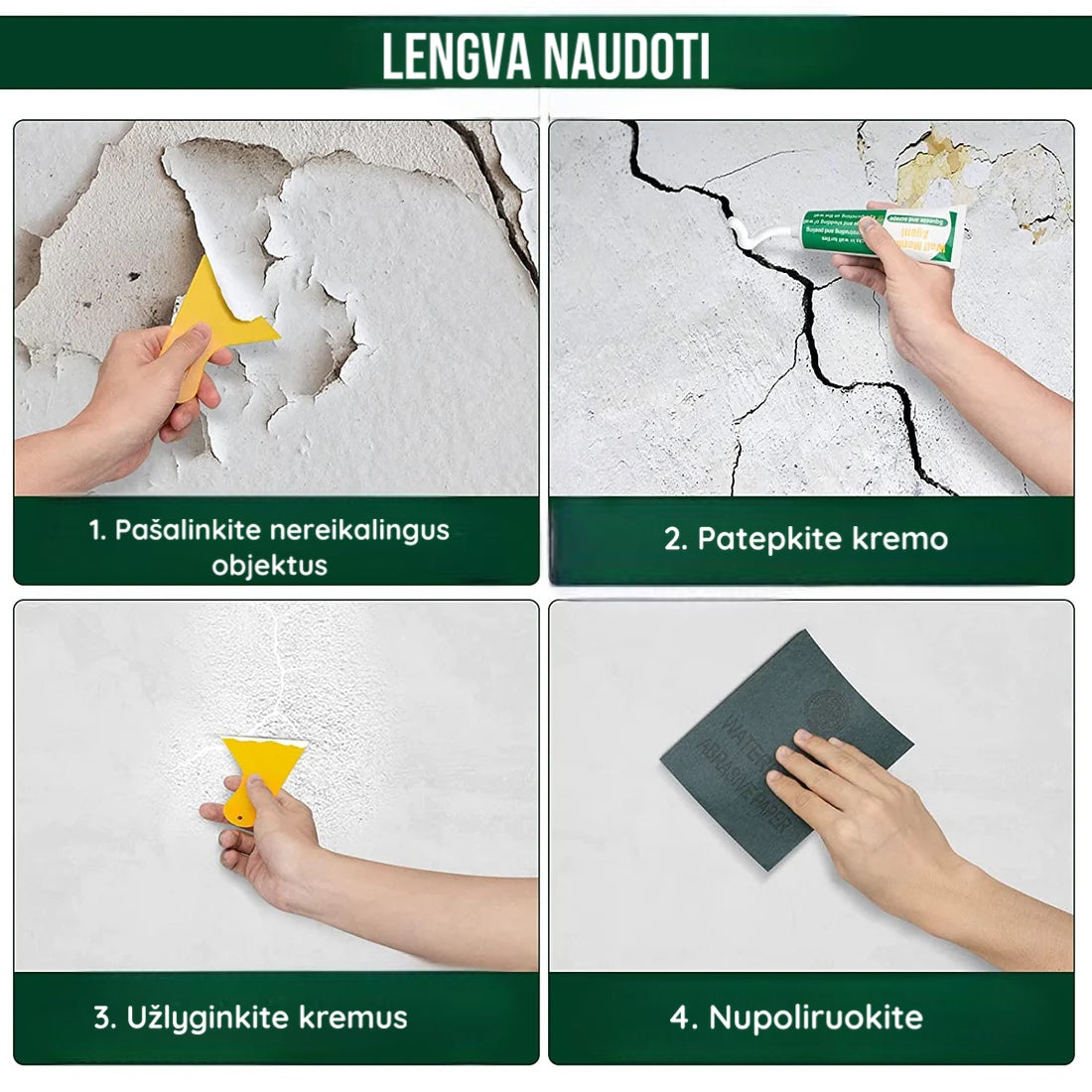 1 veiksmas: prieš naudodami pašalinkite sienų lupimąsi, nukritimą ir miltelių kritimą.