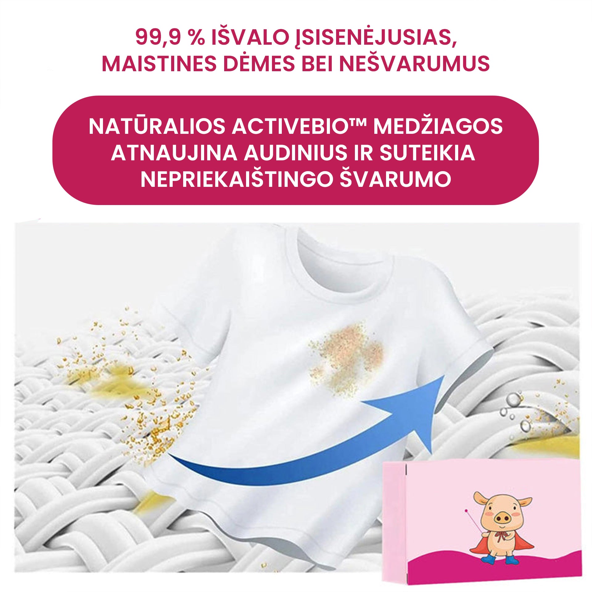 - 99,9 % išvalo sunkiai įveikiamus riebalus, purvą, nešvarumus bei maistinės dėmes. Natūralios ActiveBio™ medžiagos atnaujina audinius bei suteikia nepriekaištingo švarumo.