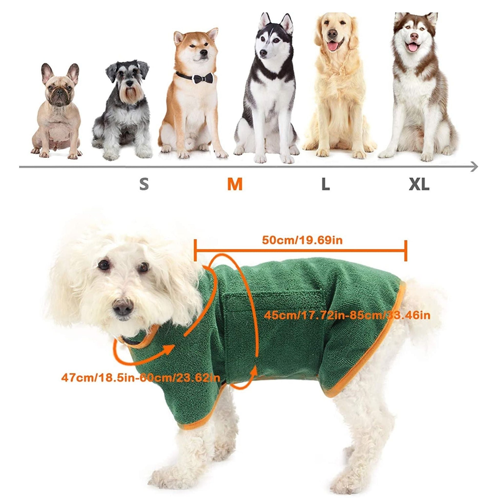 - Chalatas sugeria visą drėgmę, todėl galite jaustis ramūs, jog augintinis po maudynių nepaliks vandens dėmių ant sofos, lovos ar kilimo. Tinkamą chalato dydį rekomenduojama pasirinkti atsižvelgus į pateiktą dydžių lentelę.