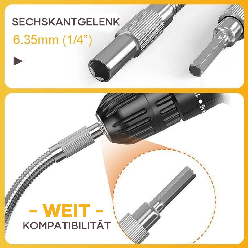 - Šio gręžimo veleno dėka pasieksite, net sunkiai prieinamas vietas su grąžtu! Ypatingai lankstus ir funkcionalus velenas užtikrins saugų ir greitą varžtų atsukimą!