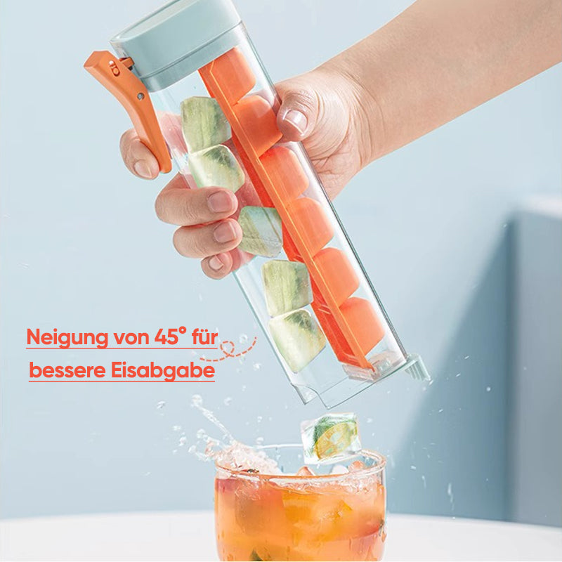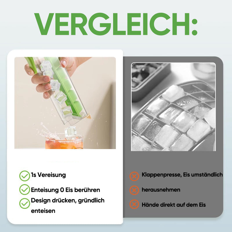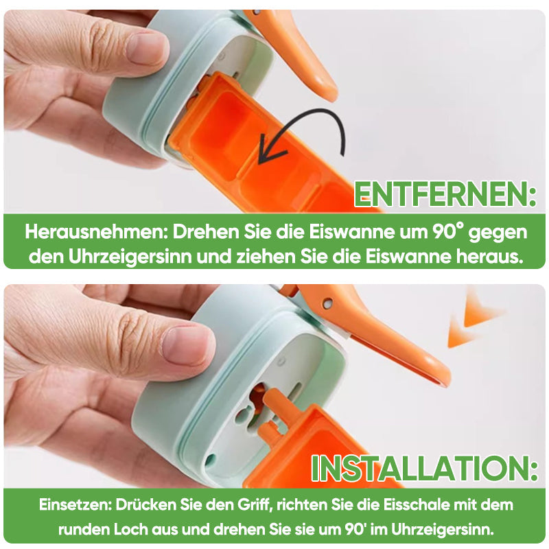 - Dėkle yra 6 ledukų formelė, kurioje galima suformuoti skirtingų skonių ledukus. Norėdami išimti ledukus reikia spustelti rankenėlę į apačią ir ledukai iškris tiesiai į stiklinę. Specialus mechanizmas leidžia ledukus išimti saugiai, nepažeidžiant jų formos.