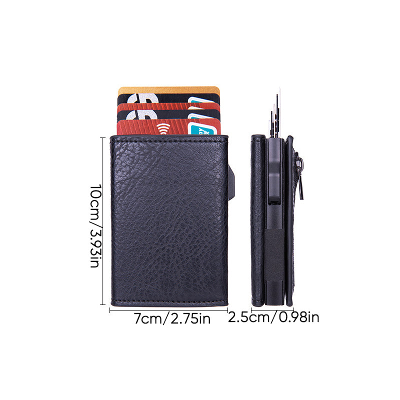 - Tai idealus sprendimas vyrams, kurie nemėgsta nešiotis didelių piniginių ar rankinių kartu su savimi. Kompaktiška piniginė, kurioje tilps visos reikiamos korteles bei valiutos. Automatinė kortelių išstūmimo funkcija leis patogiai ištraukti reikiamą kortelę bei įdėti atgal.